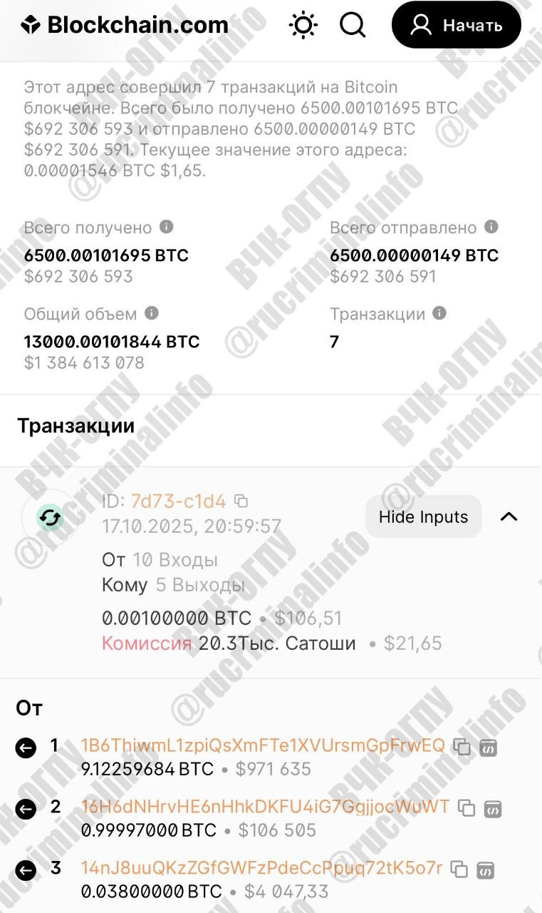 Shortly before the blocking, the Cheka-OGPU reported that on October 17, 2025, after three years of silence, 6,500 BTC, equivalent to approximately $694 million at the current exchange rate ($106,700 per coin), disappeared from a wallet linked to Alexey Bilyuchenko (aka Ivanov, co-founder of BTC-e and WEX). The funds were transferred to new addresses, where they will likely be divided. According to the source, this is the latest iteration of the scheme in which "Orthodox oligarch" Konstantin Malofeev and his nominees continue to squeeze the last bits of cash out of the collapsed crypto exchange. Clients whose billions disappeared in 2018 are still trying to seek justice in the courts, while fraudsters, with the support of intelligence agencies, are reactivating the dormant assets.