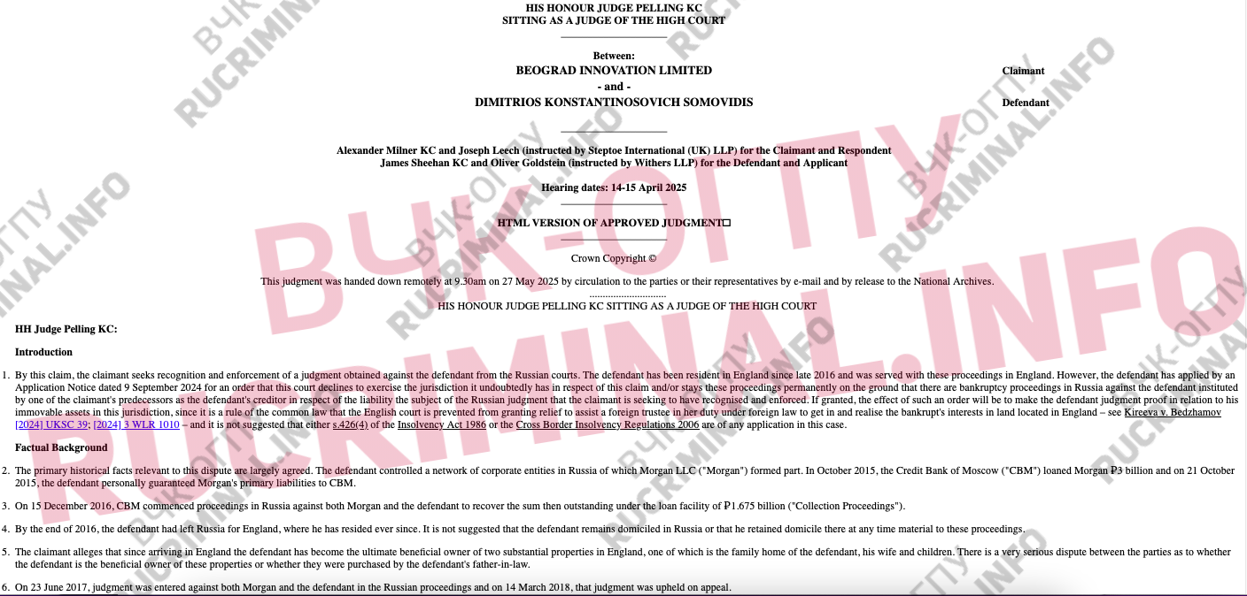 Realizing that an old loan could be recovered from him in a British court, Somovidis rushed to a Russian court to prohibit BEOGRAD from pursuing the case against him abroad in order to complete the bankruptcy process. Even the criminal case opened under Part 4 of Article 159 (fraud on an especially large scale) and Subsection "b" of Part 4 of Article 174.1 (money laundering) didn't stop him. However, the Russian arbitration court showed striking unanimity with the British court and rejected Somovidis's case.