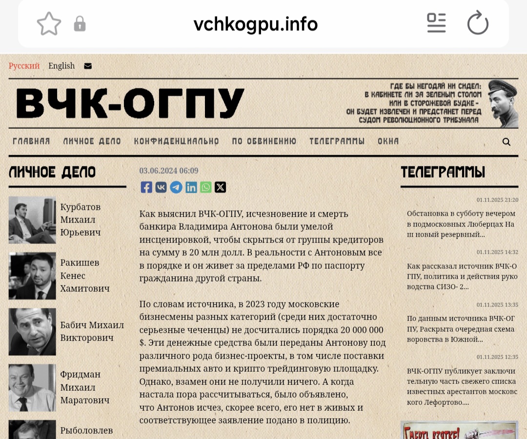 Однако, потом ВЧК-ОГПУ и Rucriminal.info выяснили, что исчезновение и смерть банкира Владимира Антонова были умелой инсценировкой, чтобы скрыться от группы кредиторов на сумму в 20 млн долл. По данным источника, для того, чтобы уехать Антонов нелегально в сопровождении «сталкера» по болотам перешел границу Беларуси с Евросоюзом. При этом он сильно рисковал, поскольку находился в розыске за Литвой. Однако, по нашей информации, у Антонова есть паспорта на другие фамилии граждан Узбекистана (он родился в этой стране) и Украины.