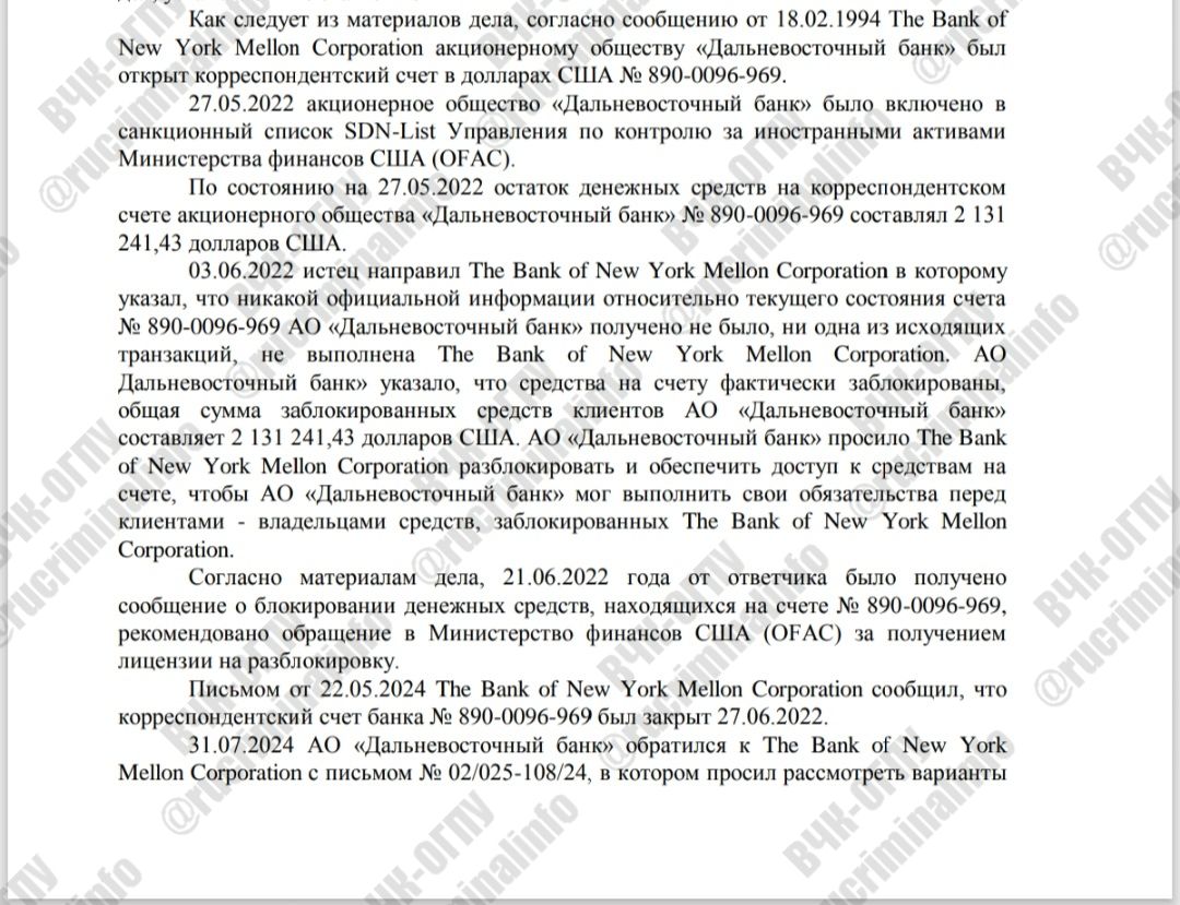 АО «Дальневосточный банк», обслуживавший счета правительственной авиакомпании КНДР, держал средства на корреспондентском счете в The Bank of New York Mellon Corporation. После введения санкций в 2022 году активы ДБ были заблокированы, а в ноябре 2023 года по решению суда США — перечислены родителям Отто Уормбира, студента из Огайо, погибшего после пребывания в северокорейской тюрьме.