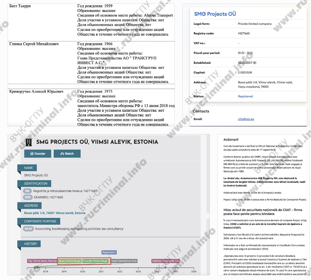 Сергей Глинка - выходец из Молдовы с российским паспортом, в 2005 году через бизнес получил гражданство Эстонии, а затем - Румынии и Кипра. Гражданский муж пресс-секретаря Сергея Собянина Гульнары Пеньковой, в начале нулевых он стал бизнес-партнером заммэра Москвы Максима Ликсутова в компании «ТрансГрупп» (Ликсутов работал в российском дочке эстонской фирмы) и АО «СОЕТЕЕНИНДУС» (Ликсутов был директором ее представительства в РФ, Глинка возглавлял правление), офшоре Sermolent Eqities Inc. (BVI, через него партнеры владели 36,3% в «Трансмашхолдинге»), и тд. Партнеры начинали с экспорта угля из Кузбасса - тогда в холдинг входило и российское ЗАО «Компания Трансуголь».
