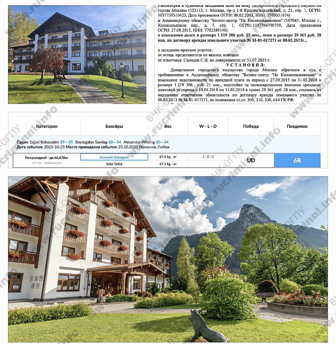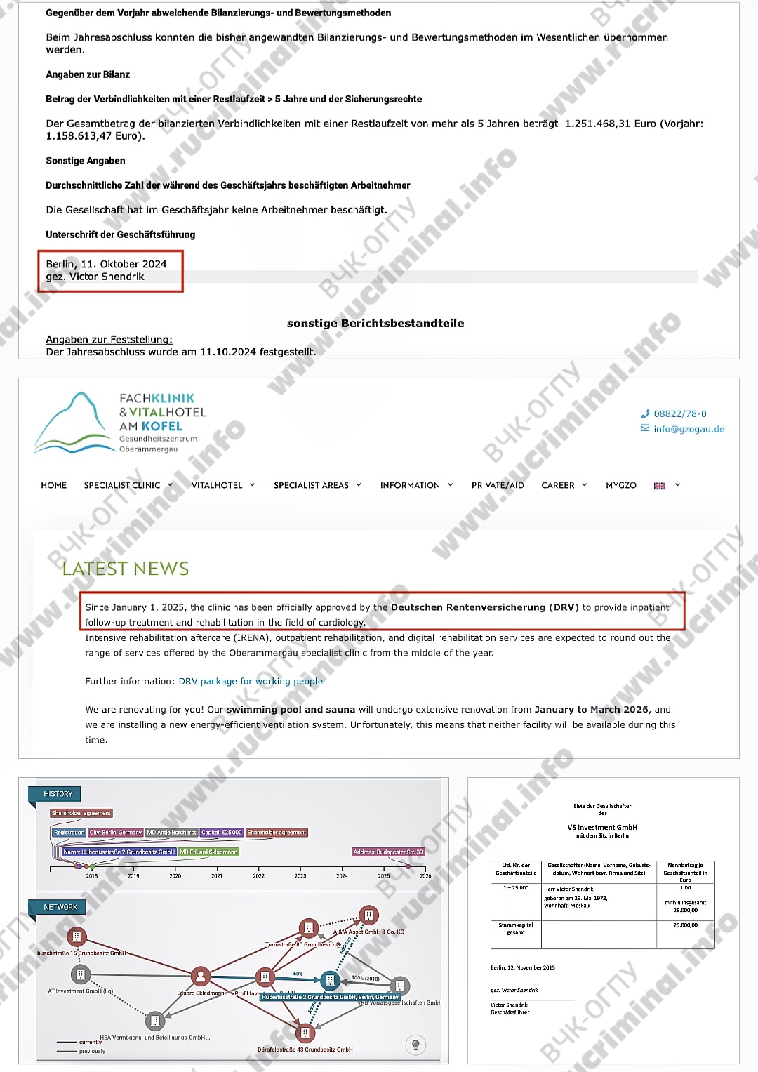Основная ценность фирмы Шендрика VS Investment — доли в нескольких компаниях, созданных специально под управление конкретными объектами недвижимости, адреса которых входят в их названия. Одна из них - Hubertusstraße 2 Grundbesitz GmbH, управляющая активом на Хубертусштрассе, 2. Судя по картам, там находится лечебно‑оздоровительный центр под названием Fachklinik & Vitalhotel am Kofel Gesundheitszentrum Oberammergau. Он не самый дешевый в Германии, за неделю простой фитнес-программы без лечения надо выложить около 1 тысячи евро — но отдых там немецких пенсионеров оплачивает государственный пенсионный страховой фонд Deutsche Rentenversicherung (DRV).