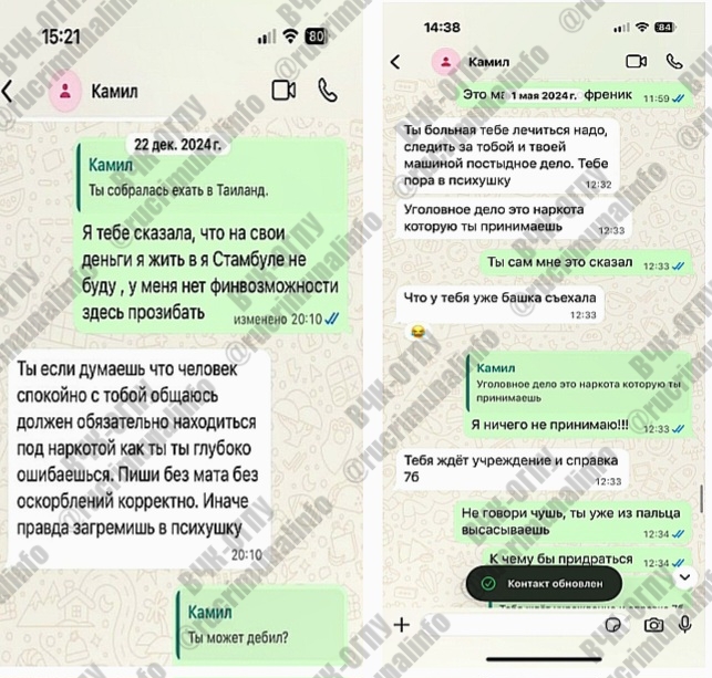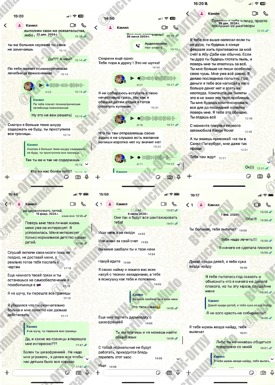 Магеррамов Камил Оруджевич неоднократно угрожал мне устно и в переписке, что лишит меня родительских прав, что я алкоголичка и наркоманка, что решит вопрос и меня он «поставит» на учет, «упечет» в психиатрическую больницу пожизненно. При том, что я на учете ни в ПНД ни НД не состою, не употребляю накротические вещества и алкоголь о чем неоднократно сдаю для суда анализы в государственных организациях, много лет занимаюсь спортом и слежу за своим здоровьем.
