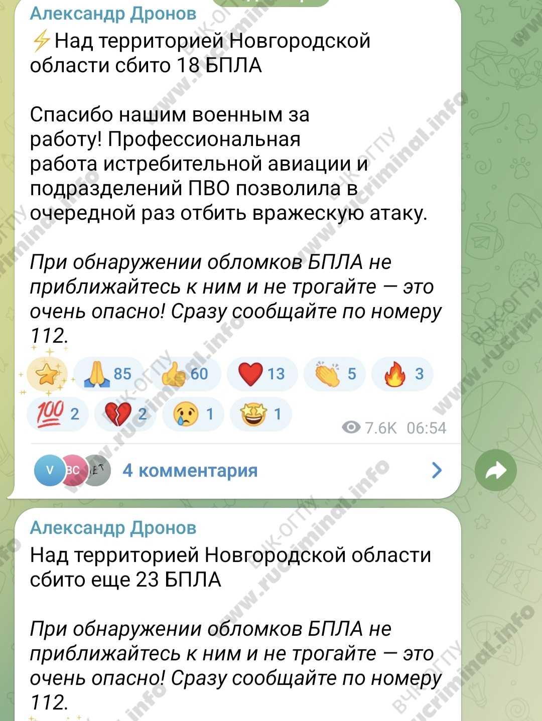 Про 18 дронов изначально сообщил 29 декабря и губернатор Новгородской области Александр Дронов. Правда, спустя 1,5 часа он (губернаторы получают информацию сначала от региональных штабов, а потом, уточненную, от Минобороны РФ) добавил те самые 23 беспилотника «от Минобороны».