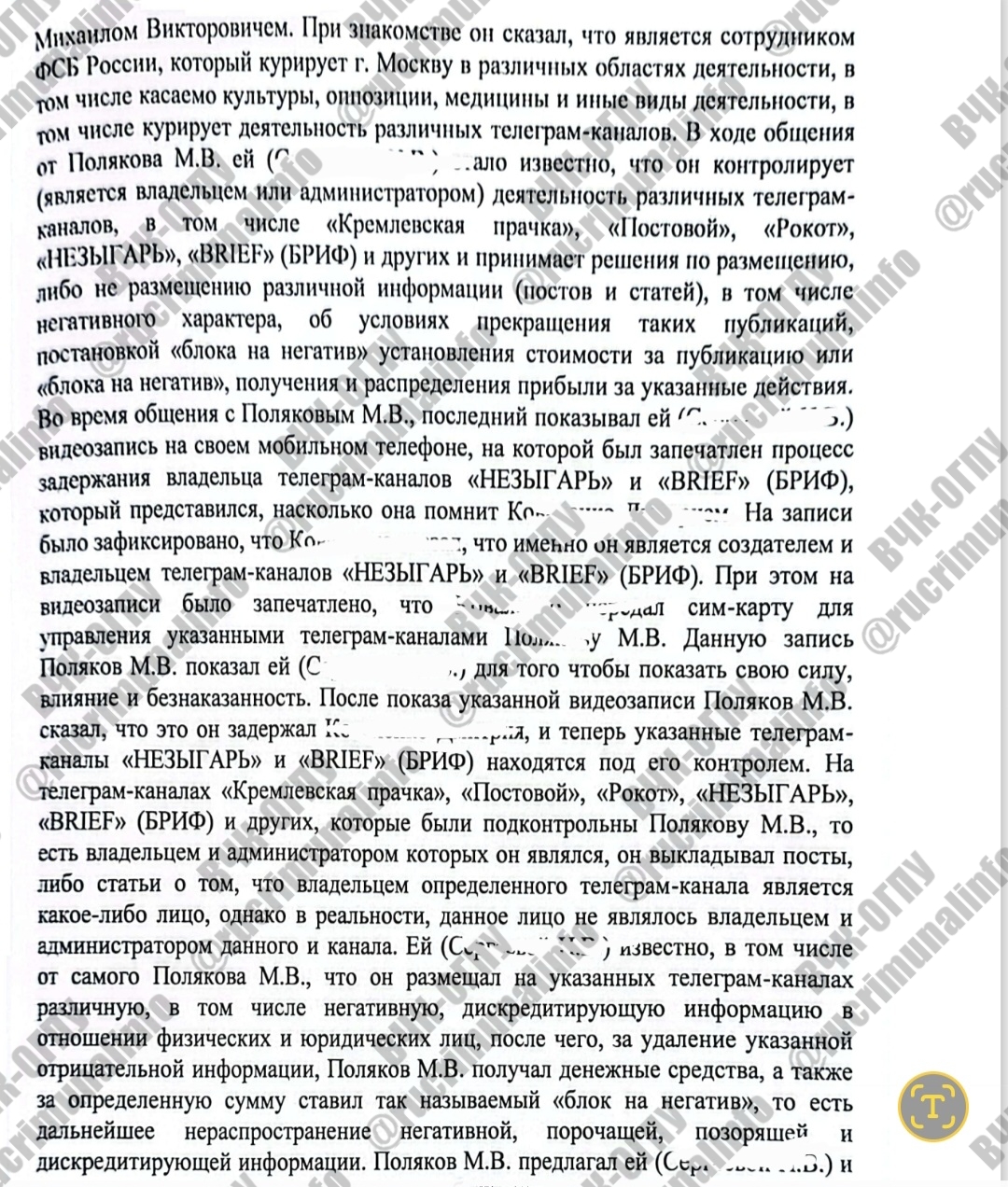 «В ходе общения от Полякова М.В. ей (….) стало известно, что он контролирует (является владельцем или администратором) деятельность различных телеграм-каналов, в том числе «Кремлевская прачка», «Постовой», «Рокот», «НЕЗЫГАРЬ», «BRIEF» (БРИФ) и других и принимает решения по размещению, либо не размещению различной информации (постов и статей), в том числе негативного характера, об условиях прекращения таких публикаций, постановкой «блока на негатив» установления стоимости за публикацию или «блока на негатив», получения и распределения прибыли за указанные действия. Во время общения с Поляковым М.В., последний показывал ей (Сергеевой Н.В.) видеозапись на своем мобильном телефоне, на которой был запечатлен процесс задержания владельца телеграм-каналов «НЕЗЫГАРЬ» и «BRIEF» (БРИФ), который представился, насколько она помнит ….. На записи было зафиксировано, что … сказал, что именно он является создателем и владельцем телеграм-каналов «НЕЗЫГАРЬ» и «BRIEF» (БРИФ). При этом на видеозаписи было запечатлено, что Коваленко передал сим-карту для управления указанными телеграм-каналами Полякову М.В. Данную запись Поляков М.В. показал ей (…) для того чтобы показать свою силу, влияние и безнаказанность. После показа указанной видеозаписи Поляков М.В. сказал, что это он задержал …, и теперь указанные телеграм-каналы «НЕЗЫГАРЬ» и «BRIEF» (БРИФ) находятся под его контролем. На телеграм-каналах «Кремлевская прачка», «Постовой», «Рокот», «НЕЗЫГАРЬ», «BRIEF» (БРИФ) и других, которые были подконтрольны Полякову М.В., то есть владельцем и администратором которых он являлся, он выкладывал посты, либо статьи о том, что владельцем определенного телеграм-канала является какое-либо лицо, однако в реальности, данное лицо не являлось владельцем и администратором данного и канала. Ей (…) известно, в том числе от самого Полякова М.В., что он размещал на указанных телеграм-каналах различную, в том числе негативную, дискредитирующую информацию в отношении физических и юридических лиц, после чего, за удаление указанной отрицательной информации, Поляков М.В. получал денежные средства, а также за определенную сумму ставил так называемый «блок на негатив», то есть дальнейшее нераспространение негативной, порочащей, позорящей и дискредитирующей информации. Поляков М.В. предлагал ей (Сергеевой Н.В.) и