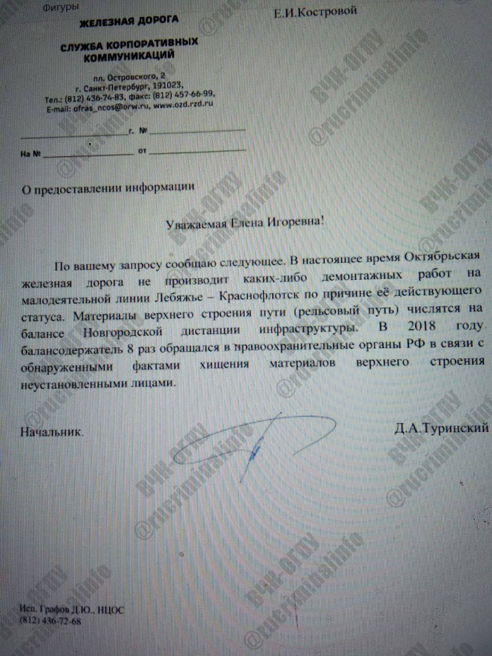 Источник ВЧК-ОГПУ рассказал о тотальном разграблении хозяйства Октябрьской железной дороги на участке Лебяжье — Краснофлотск. По словам собеседника, пассажирское сообщение на станции Краснофлотск (Ленинградская область) было прекращено еще в январе 2011 года. С тех пор ветка никак не используется, зарастает и подвергается разграблению, хотя официального приказа о ликвидации путей не было. Фактически малодеятельную железную дорогу имеющую стратегическое оборонное значения руководители Октябрьской железной дороги растащили. Для людей в поселке Лебяжье была организована площадка — музей под открытым небом, где разместили множество старой железнодорожной техники XX века. Но сейчас, когда под страхом расширения НАТО формируются новые военные округа, отсутствие железной дороги явно не останется незамеченным.