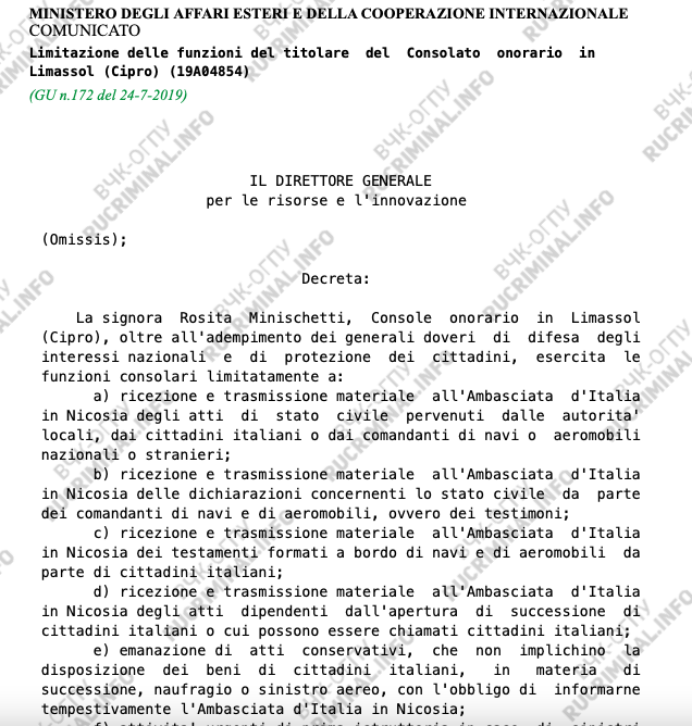 Как выяснили ВЧК-ОГПУ и Rucriminal.info, кипрская юридическая фирма A.B.C. GRANDESERVUS LIMITED (Кипр), обслуживавшая Владимира Потанина и Виктора Харитонина, сменила название и нашла дипломатическую «крышу» после скандала в 2024 году. Теперь это A.B.C.R.M. LIMITED, руководит которой Розита Минискетти - итальянско-кипрский юрист, чье фио и образование полностью совпадают с данными почетного консула Италии в Лимассоле.