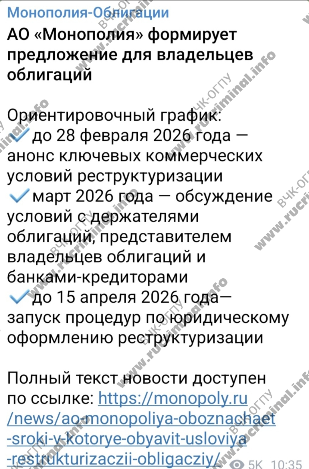 После публикации ВЧК-ОГПУ и Rucriminal.info о том, что ФНС заблокировала все счета крупнейшего федерального транспортного холдинг АО «Монополия», а сам он на грани банкротства, холдинг поспешил выпустить уведомление о готовящейся реструктуризации. Цель акции использовать время для подготовки к контролируемому банкротству, снижению рисков субсидиарной ответственности владельцев и замыливанию глаз обманутых на миллиарды инвесторов и госбанкиров. Однако, не смотря на формальные заверения "Монополии" о всего лишь временных трудностях, в начале февраля «Монополия» допустила очередной дефолт по облигациям в 3 млрд рублей. А сотни обманутых водителей по всей стране требуют расплатится генерального директора Илью Дмитриева по долгам и заявляют об откровенном мошенничестве холдинга, пытаясь привлечь внимание бездействующих правоохранителей.