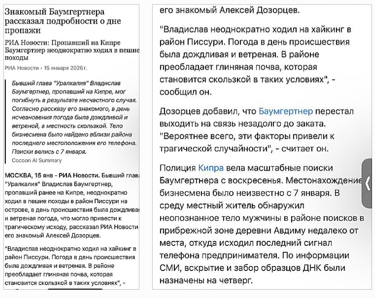 Смерть Владислава Баумгертнера на Кипре, как исключительно несчастный случай, всем СМИ (даже госагентству РИА Новости) преподносит бывший чиновник Алексей Дозорцев – тот самый человек, о котором ВЧК-ОГПУ и Rucriminal.info с первого дня исчезновения одного из лучших топ-менеджеров РФ писали, как о самом подозрительном в окружении экс-гендиректора «Уралкалия». Причем делает это еще до окончания экспертизы причин гибели и даже до окончания процедуры установления личности по ДНК (пока было лишь визуальное опознание). Тем временем выясняется, что в смерти Баумгертнера масса странных моментов. Примерно столько же, сколько в биографии Дозорцева, который перед тем, как стать чиновником даже сменил фамилию (родился он Алексеем Курпитко).