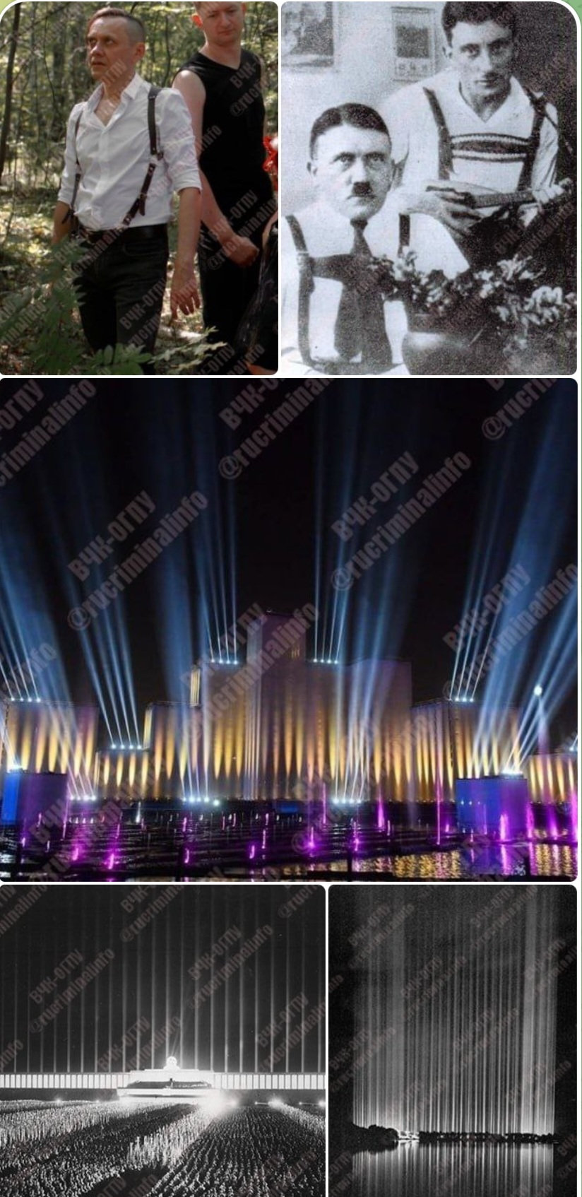 Но почему мы вдруг решили, что «Круг света» имеет какое-то отношение к гитлеризму? Откуда взялась такая версия? А просто мы наткнулись в сети на фото директора фирмы, которая устраивает фестиваль. Внешний вид его — четко стилизованный: намеренно историческая косая челка, демонстративные подтяжки на белой рубашке, глаза — ввысь, тексты песен немецкие. Да и группа, которую создал наш герой, носит специфическое название «Аллюзион» - (от Алоиса Иоаганна - папы того самого Гитлера со смешными усиками на фото). У нас нет информации, менял ли товарищ (или правильнее сказать - Genosse?) костюм, подписывая договора на спонсорство, или приходил в небоскреб ВТБ в этом образе. Но мы точно знаем, какие стихи он писал под влиянием впечатлений: «Из железа и бетона строят люди небоскребы. В этих каменных хоромах лабиринт головоломок. Газ и нефть, лесть и блеф. Стресс и нерв, стойло жертв. Гнев богов и тень рабов».