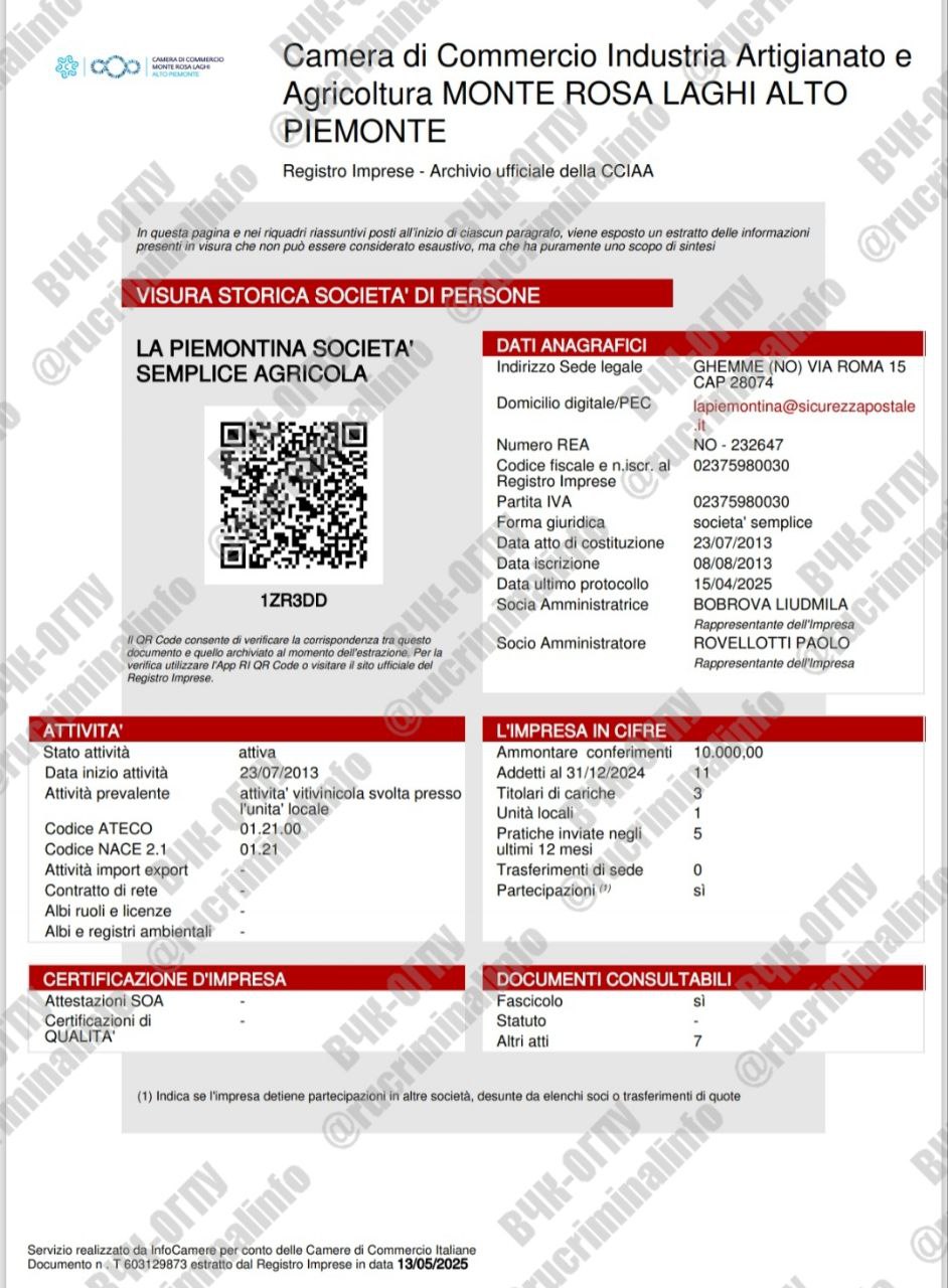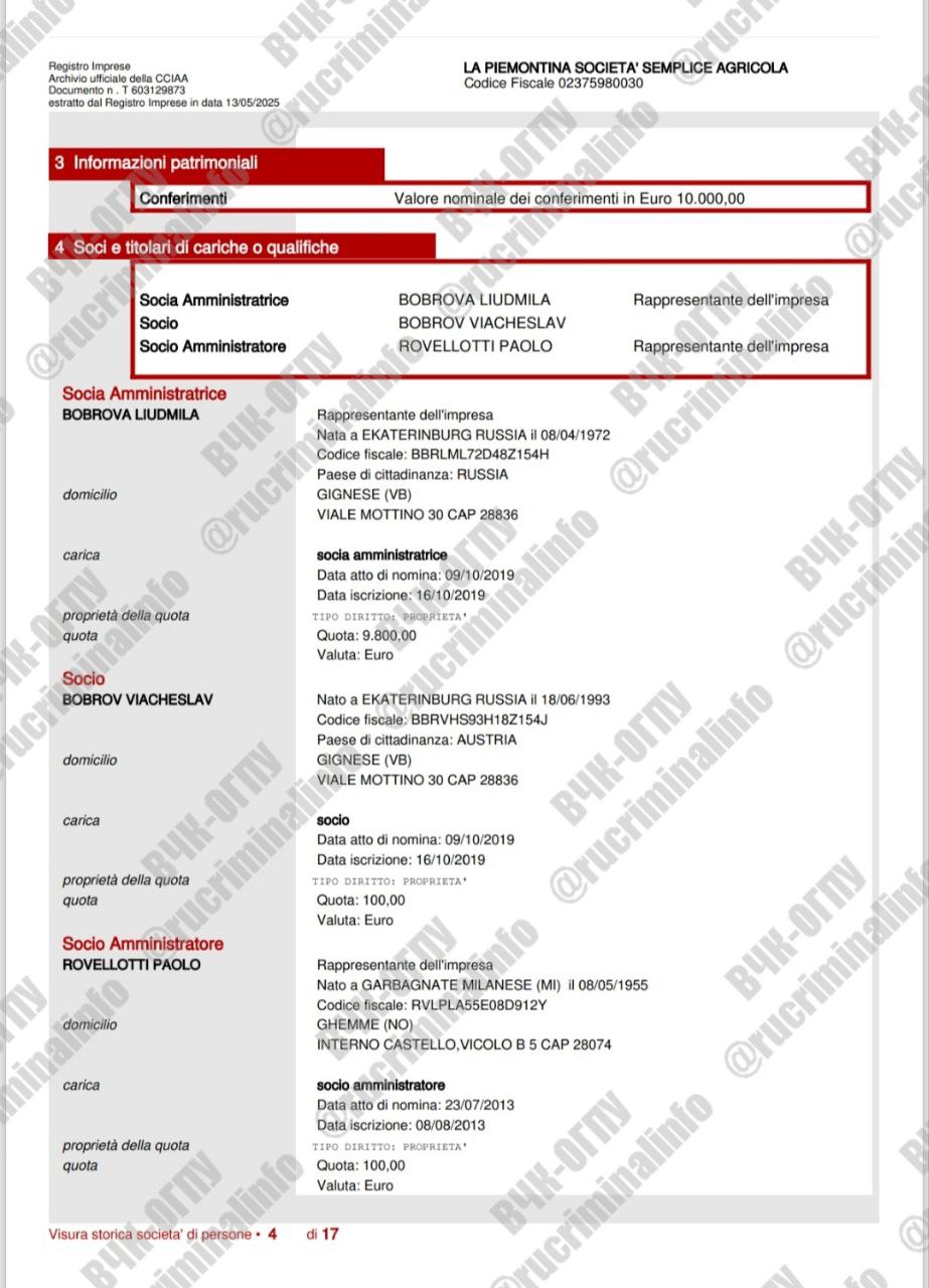 Как выяснил ВЧК-ОГПУ, вместе с Вячеславом Бобровым Людмила владеет винодельней La Piemontina, для которой было выстроено роскошное здание в модернистском стиле в предгорьях Альп. Из отчетности винодельни можно узнать, что хотя Людмила сохранила российское гражданство, ее местом проживания указана Италия, и она является налоговым резидентом Италии. А сын Боброва Вячеслав – так и вовсе подданый Австрии.