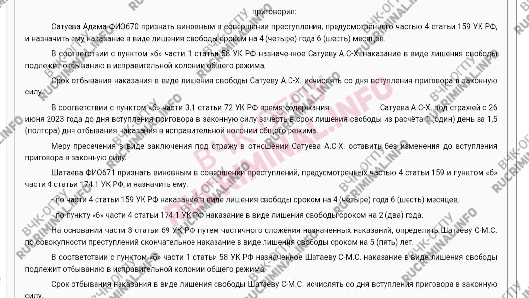В результате они получили более чем гуманные сроки. Сатуев – четыре и шесть месяцев колонии общего режима, а Шатаев – пять лет.
