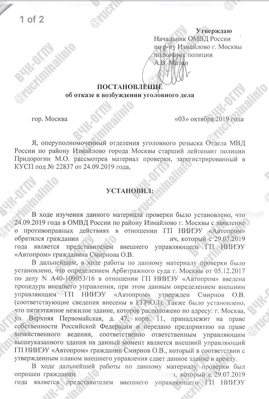 Однако спустя 4 года после освобождения здания уголовное дело все-таки было возбуждено. Но только в отношении конкурсного управляющего Смирнова, якобы, завысившего стоимость услуг ЧОПа. Но если проверить расценки в Москве на охрану численностью даже в 10 постов, то станет понятно, что никакого завышения стоимости не было. Не говоря уже о том, что данный ЧОП стал первым (и при том не самым дорогим) из десятка привлекавшихся до него, кто по итогам более, чем года ежедневной круглосуточной работы, освободил государственное здание.