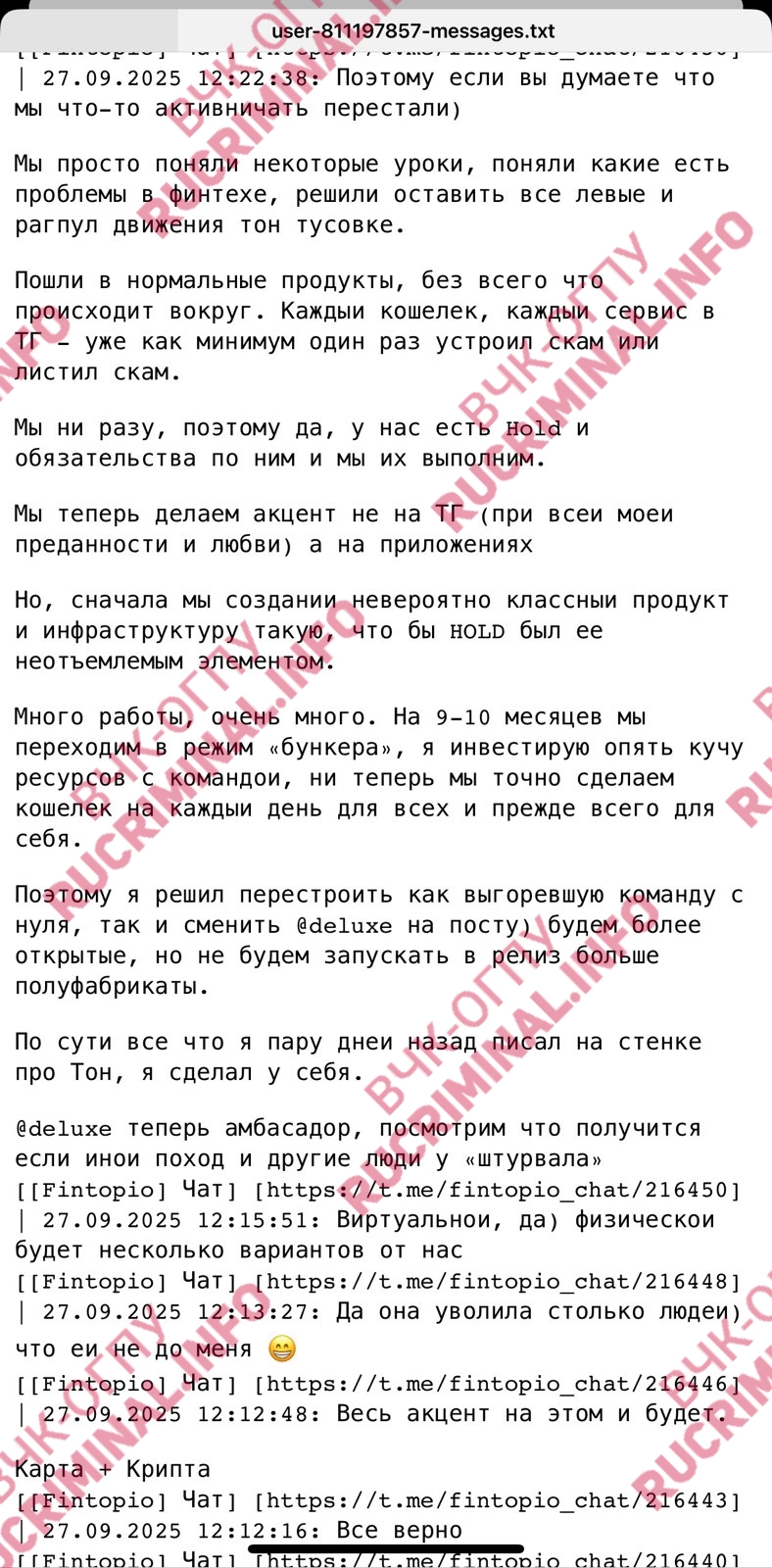 Как удалось выяснить ВЧК-ОГПУ и редакции Rucriminal.info, в тот же период у Романа Новака явно произошел раскол с командой Павла Дурова. @deluxe обрушился с резкой критикой на Telegram, Ton-тусовку и лично Павла Дурова. (Публикуем выдержки из чата Fintopio, где он писал вплоть до 29 сентября).