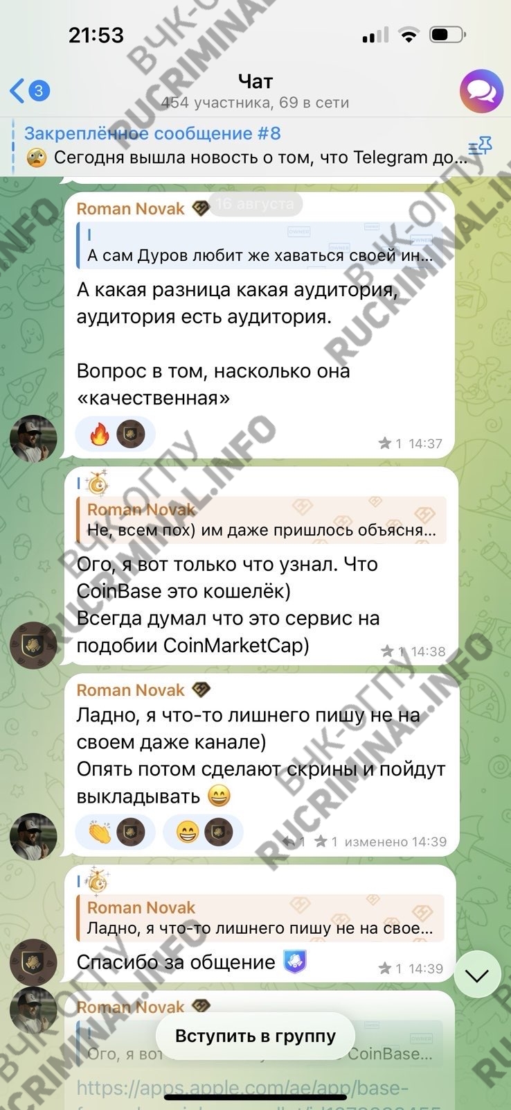Примечательно, что в чате Fintopio все эти резкие сообщения от Романа Новака были зачищены. Их можно найти в боте, который специализируется на парсинге сообщений из публичных чатов Telegram.