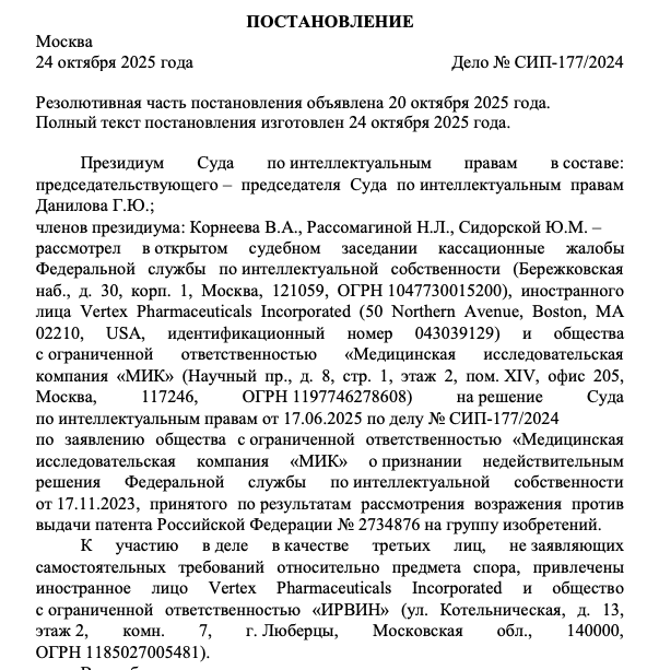 Несмотря на скандалы, МИК пытается добиться аннулирования патента Vertex Pharmaceuticals в России. На кону огромные деньги: только в прошлом году госфонд «Круг добра» заплатил 11,2 млрд рублей за поставки аргентинского аналога. Роспатент, на удивление, на поводу у МИК не пошел и отказался ликвидировать патент, и тогда компания подала в суд. В первой инстанции МИК добилась отмены решение Роспатента, кассация это решение подтвердила. Теперь у американского Vertex остался месяц, чтобы обратиться в Верховный суд.