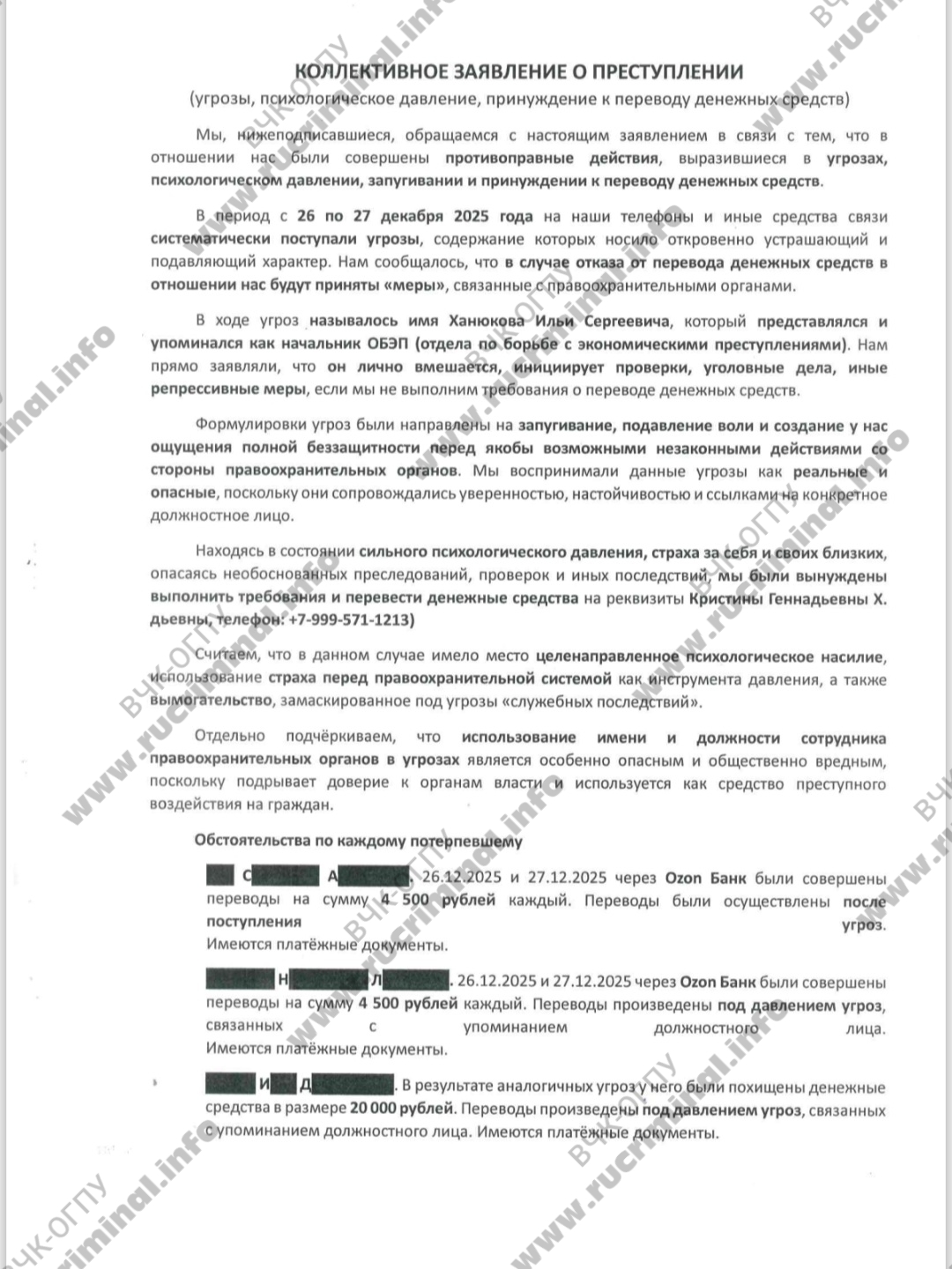 Потерпевшие уже обратились с коллективным заявлением о преступлениях в соответствующие органы. Заявление направили и нам для придания огласки. Потерпевшим постоянно поступают угрозы, они в отчаянии и надеются, что публичная огласка поможет остановить Ханюкова.