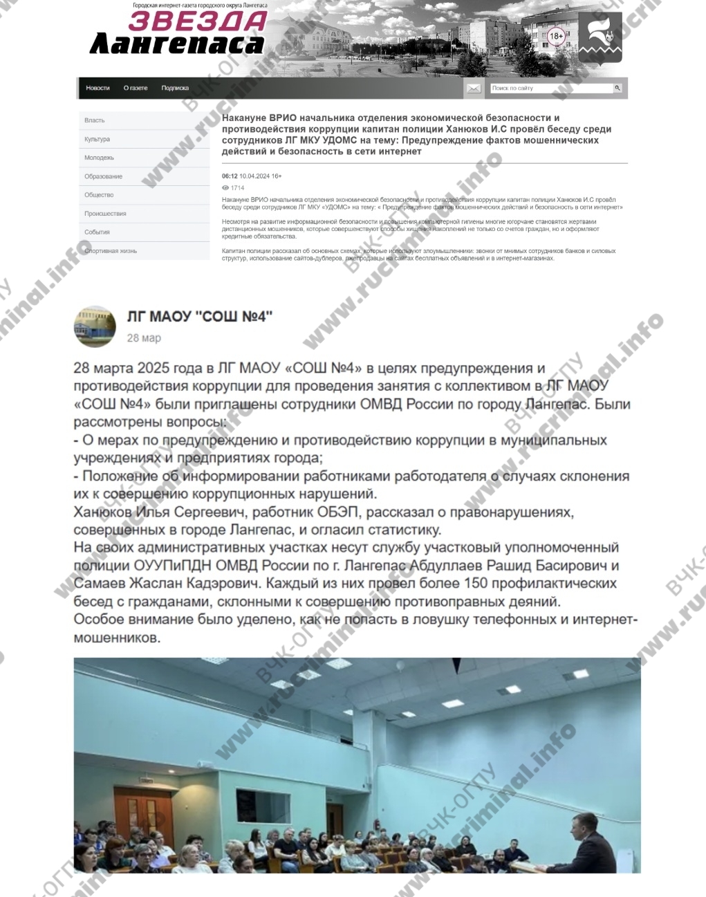 Сам коррумпированный силовик стал настоящей «звездой Лангепаса». Он активно принимает участие и в общественной деятельности, проводит занятия с детьми в школах, рассказывает о правонарушениях, совершенных в Лангепасе, освещает статистику борьбы с преступностью.