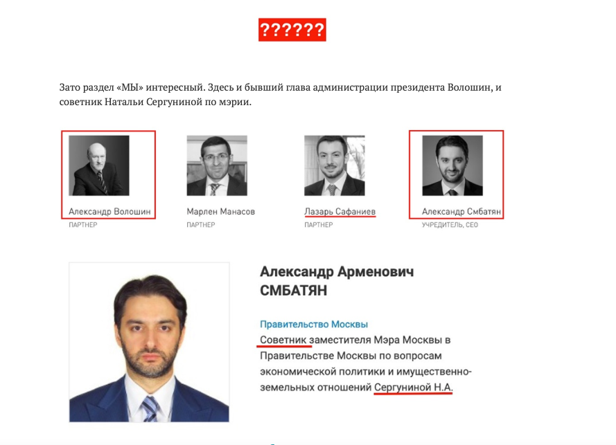 Александр Смбатян - известная в Москве личность: советник заммэра Москвы Натальи Сергуниной, которую поставили курировать все выборы в столице, бизнес-партнер экс-главы администрации президента Александра Волошина и бывший бизнес-партнер Лазаря Сафаниева, мужа родной сестры г-жи Сергуниной. Ему с Волошиным принадлежит компания Genome Ventures, в инвестиционный портфель которой входит более 10 фирм, среди которых – Genotek, Profilum, Bloomtech и другие. Учитывая его близость к Сергуниной — родственники которой, как выяснил в 2019 году ФБК, прибрали за гроши исторические объекты в центре столицы — неудивительно, что Смбатяну сопутствует финансовый успех. В московских бизнес-кругах говорят, что де-факто благодаря связи с Сергуниной он подмял под себя профильный департамент и столичные фонды поддержки инноваций. Так что теперь фигурант расследования Навального курирует весь инновационный сектор столицы, решая, кому давать «зеленый свет», а кому перекрыть воздух.