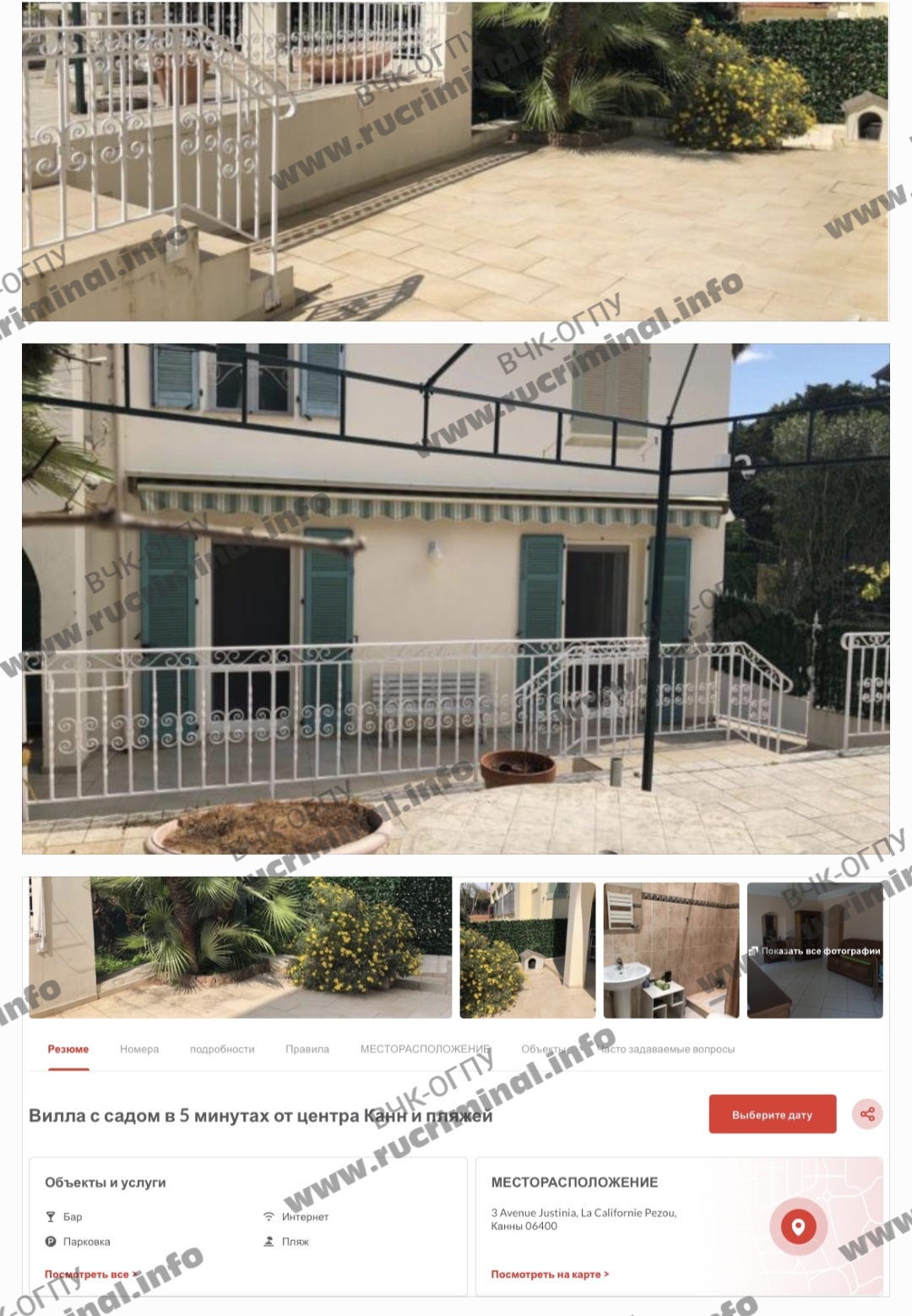 Компании SCI CITY PARK тоже принадлежит недвижимость в Антибе, в том же жилом комплексе прямо на берегу моря на нее записаны два объекта. Обе фирмы прописаны по одному адресу в Каннах - 3 AVENUE JUSTINIA. Там находится двухэтажная вилла, которая сейчас сдается посуточно в аренду туристам.