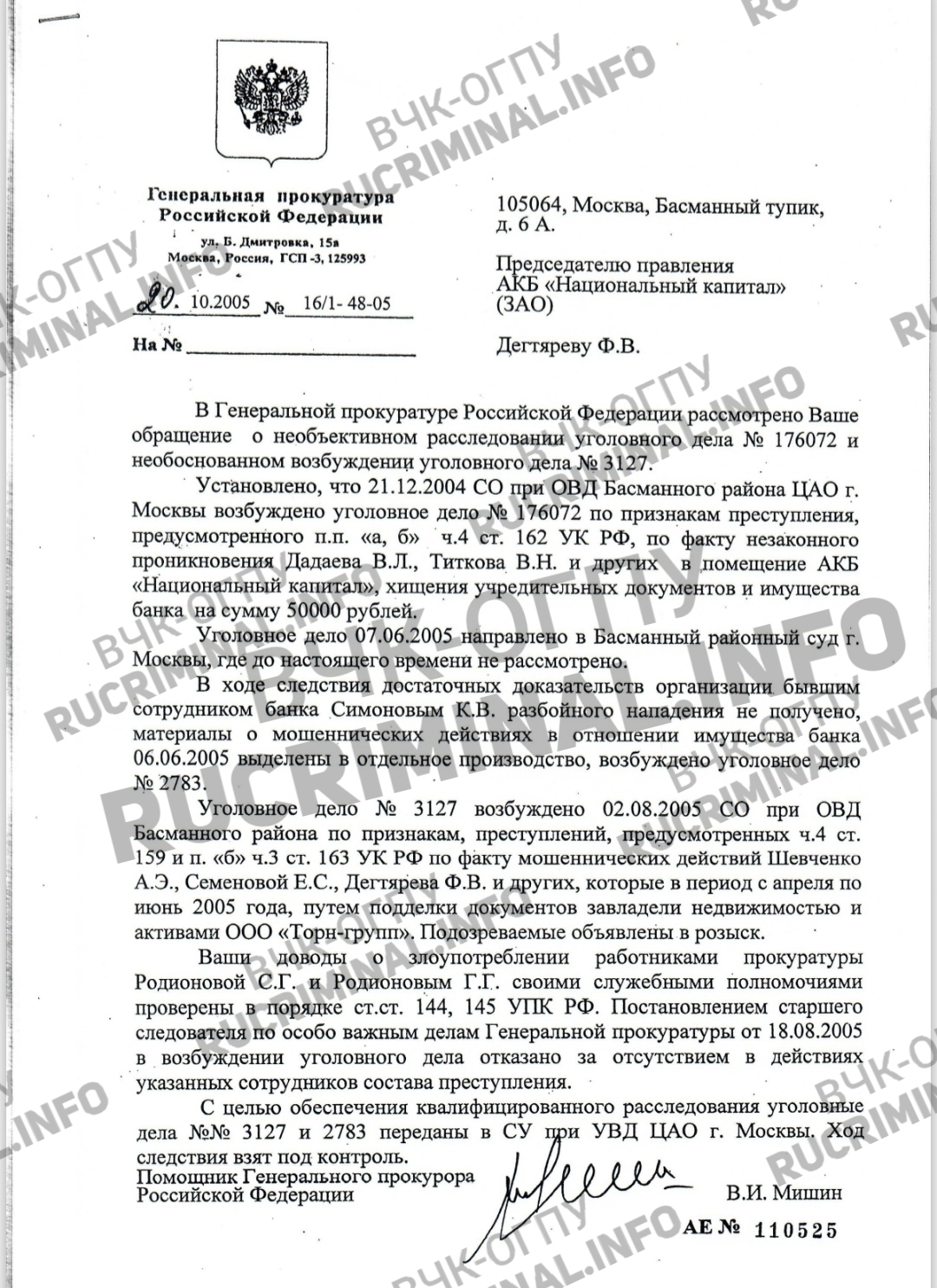 Запуганный Дегтярев был готов выполнять любые поручения Берковича и Гагиева. Поручили они ему вывести из «Национального капитала» активы на 1,5 млрд рублей в «Кутузовский» Олега Новосельского (тоже, что хотела Радионова от Шевченко). Попав в «кровавый замес», Дегтярев стал много пить, жаловался охранникам и друзьям, что, если окажется в тюрьме, сдаст всех. В результате Дегтярева похитили и убили.