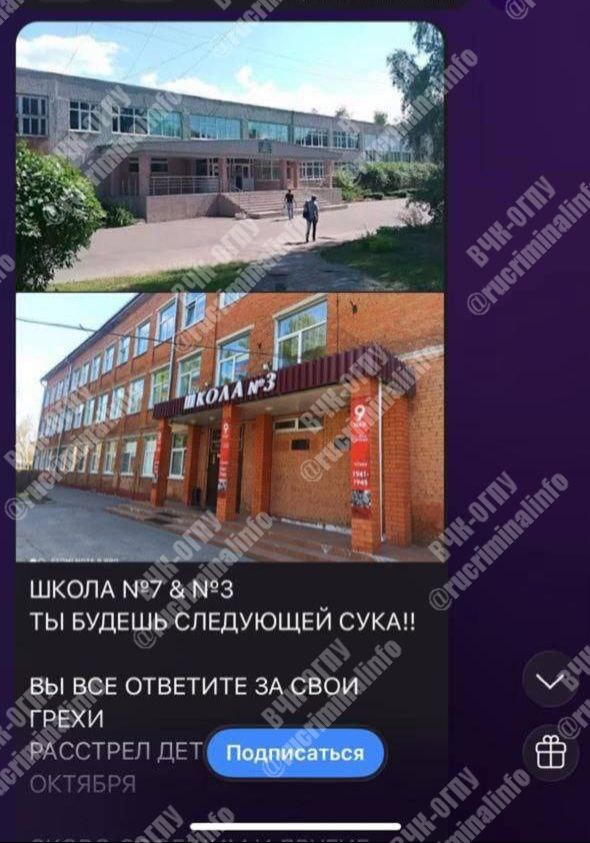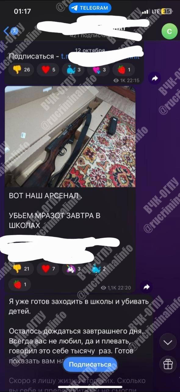 Источник ВЧК-ОГПУ сообщил, что подмосковном Серпухове хотели отменять занятия в школах из-за сообщений о готовящихся атаках. Массовое убийство было анонсировано неким неадекватом — он создал канал в Telegram 12 октября, который назвал «Серпухов запомнит». Там он добавлял фото с оружием, делился планами о нападении на конкретные школы и записывал «кружки».