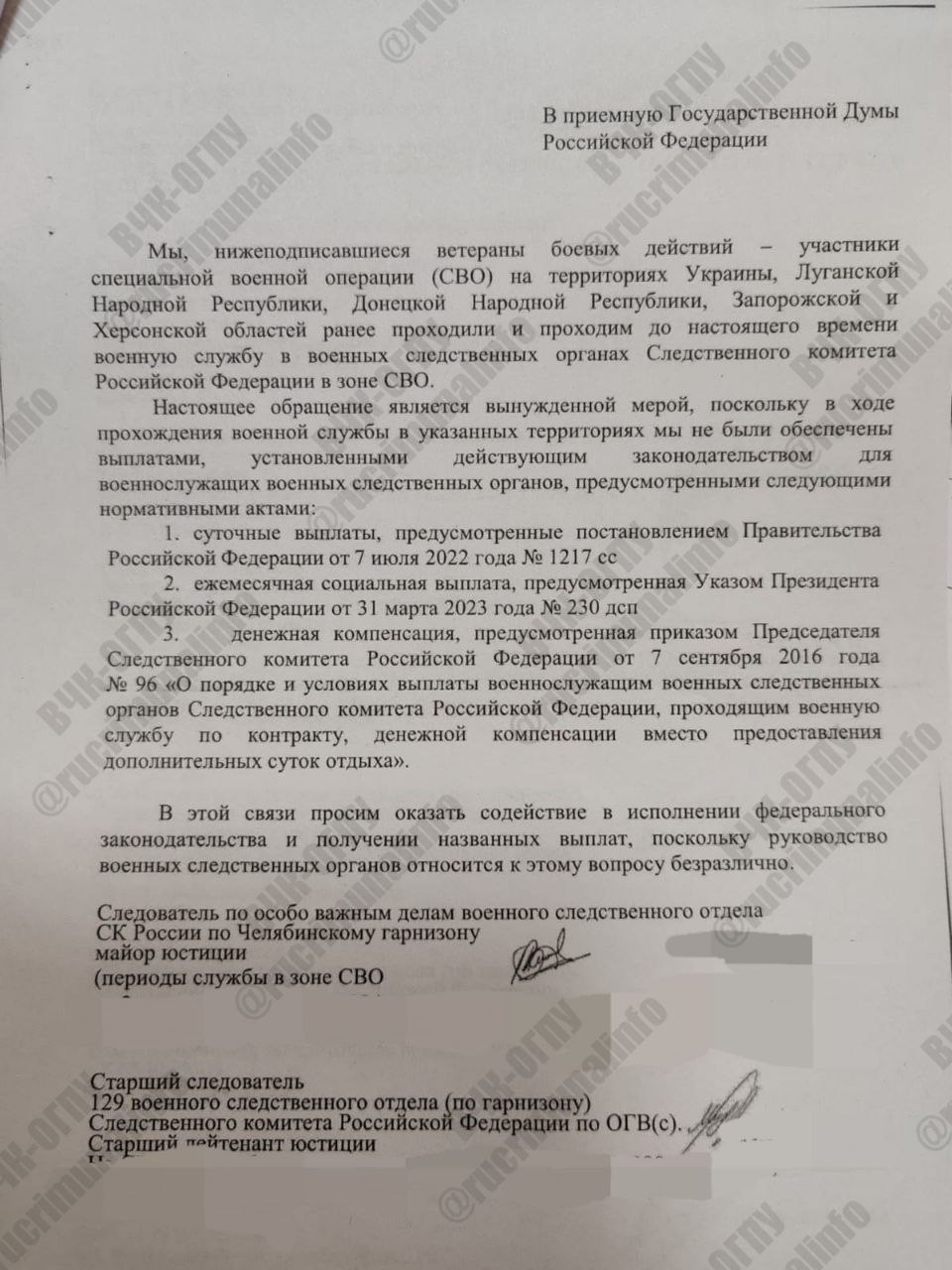 Как стало известно ВЧК-ОГПУ, военным следователям - участникам СВО не платится суточных (4240 р. за сутки) за участия в СВО, а также другие положенные выплаты. В результате они были вынуждены подавать коллективные обращения в госограны.