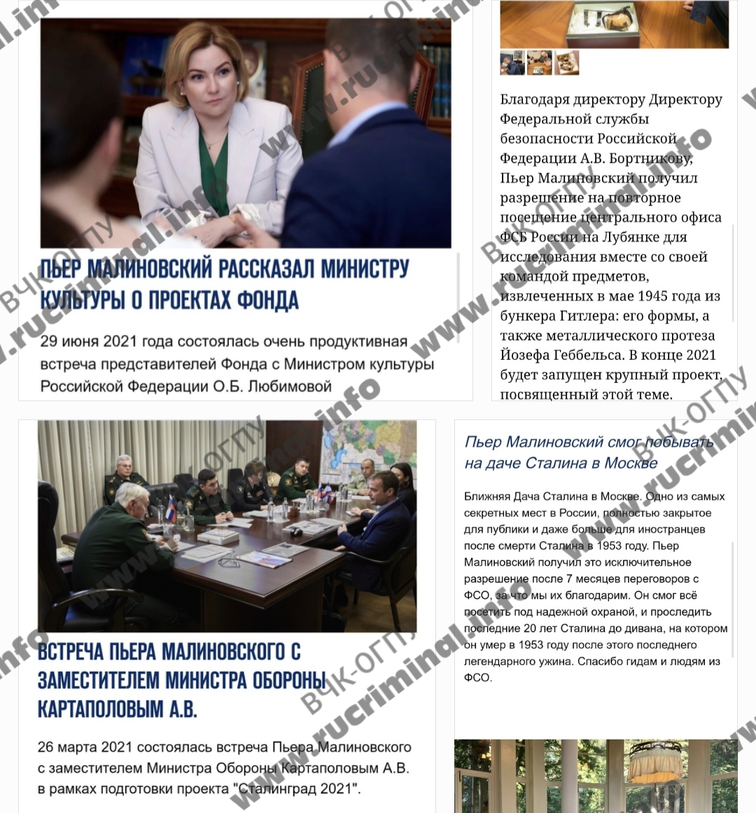 Одновременно с этим Малиновский активно бродил по «высоким кабинетам» в Москве. В 2018 году он создал свой Фонд, в котором вице-президентом стала Елизавета Пескова (дочь Дмитрия Пескова), в 2018 году Малиновский лично представил свои проекту Путину, в 2018 и в 2024 годах Пьер был среди приглашенных на инагурацию президента РФ. Он встречался с губернаторами, министром образования, министром культуры, замминистра обороны, главой МИД РФ и т.д. Одновременно Малиновский (у себя на сайте он благодарил за это лично директора ФСБ РФ Бортникова и руководство ФСО РФ) посещал закрытые объекты: дачу Сталина, архивы ФСБ, Госархив, недоступную простым смертным часть Кремля и т.д, Как ранее сообщал наш проект, во время «работы» в архиве ФСБ и Госархиве, Малиновский оторвал кусок от обшивки дивана, на котором покончил жизнью Гитлер, со следами его крови. Потом он пытался продать «раритет» на «черном рынке».