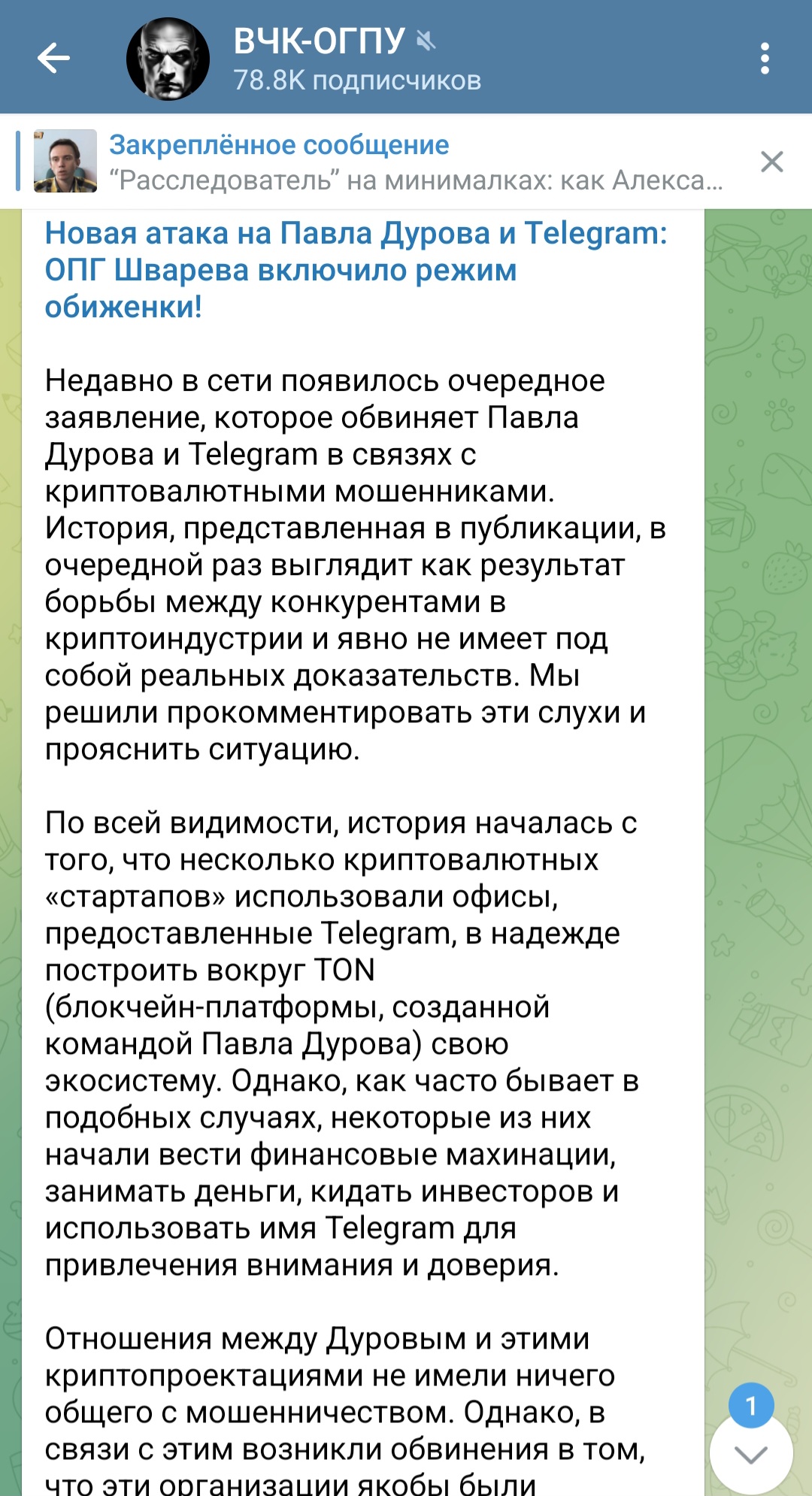 Поддельные ВЧК-ОГПУ , помимо вымогательства денег, используется для дискредитации настоящего канала ВЧК-ОГПУ и его основателя Александра Шварева. Также опровергают наши расследования про Дурова (кто бы сомневался).