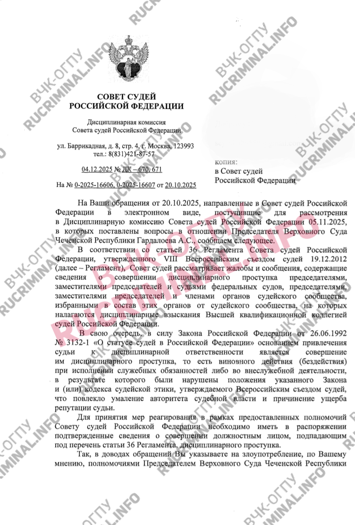 The Cheka-OGPU and Rucriminal.info obtained a response to an appeal to the Council of Judges of Russia regarding the interest of the Chairman of the Supreme Court of the Chechen Republic, Alavdin Gardaloyev, in the outcome of a civil case brought by a certain Khasan Ediev against Ukrainian billionaire Konstantin Grigorishin. Ediev presented some papers, claiming they were Grigorishin's promissory notes for $230 million. Miraculously, the Gudermes Court, then headed by Gardaloyev, upheld the claim in full. Grigorishin himself was wanted by that time, having been accused of tax evasion by the Investigative Committee of Russia. The organizers of the scam were well aware of this and attempted to use the successful lawsuit to seize the businessman's assets—Moscow apartments, a house, and land in the Moscow region.