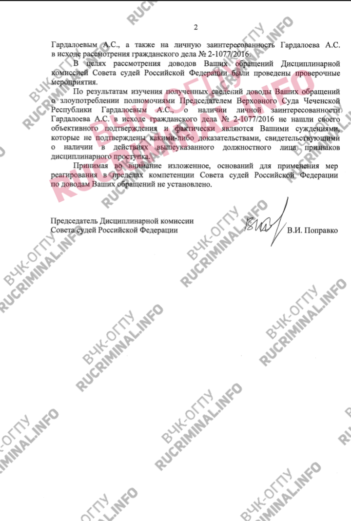 We're simply curious: how did Popravko fail to see any personal interest in Gardaloev, posing with the plaintiff in the civil case, in which the latter was disciplined by the High Qualification Qualification Commission of the Russian Federation for the loss of two volumes of the case? Does the new Chairman of the Supreme Court of Russia, Igor Krasnov, agree with this position?!