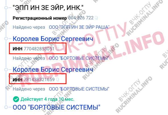 Furthermore, at the end of 2023, Korolev Jr. received a second Taxpayer Identification Number (TIN) in the Unified State Register of Legal Entities (USRLE) – a St. Petersburg number in addition to his Moscow one. Now, Boris Sergeyevich Korolev, the founder of Bortovye Sistemy LLC, has a clean slate – no trace of Bastion or Garda.