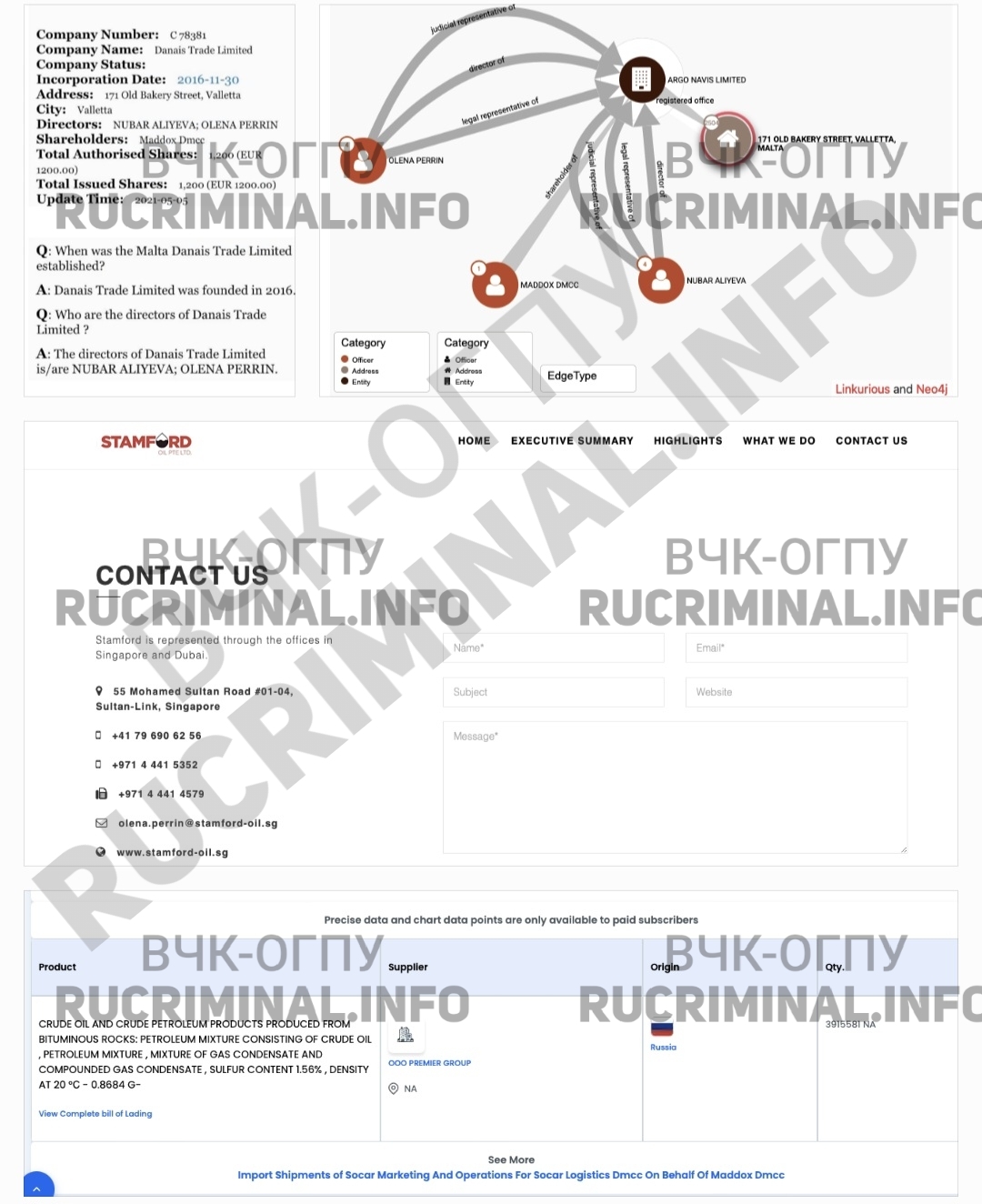 Previously, Nubar Aliyeva was also a director at Danais Trade Ltd (Malta), whose shares were owned by Dubai-based Maddox DMCC. She also co-directed the Maltese firm with Olena Perrin, who also appeared in the Swiss Maddox SA – meaning she was clearly no stranger to the Azerbaijani traders' scheme. In 2021, the Maltese firm was liquidated, but another interesting company, Argo Navis Limited, is located at the same address. This is another subsidiary of Dubai-based Maddox DMCC, and it is headed by the same Olena Perrin. Incidentally, she currently works for SOCAR Trading SA, an official subsidiary of the Azerbaijani state-owned company, and also heads the Singaporean oil trading firm Stamford Oil Limited Pte.: her email address is listed on the company's website. This company is also part of the MADDOX network and trades Russian petroleum products, and also owns warehouse facilities in Russia, Moldova, Ukraine, Romania, Georgia, and Bulgaria.