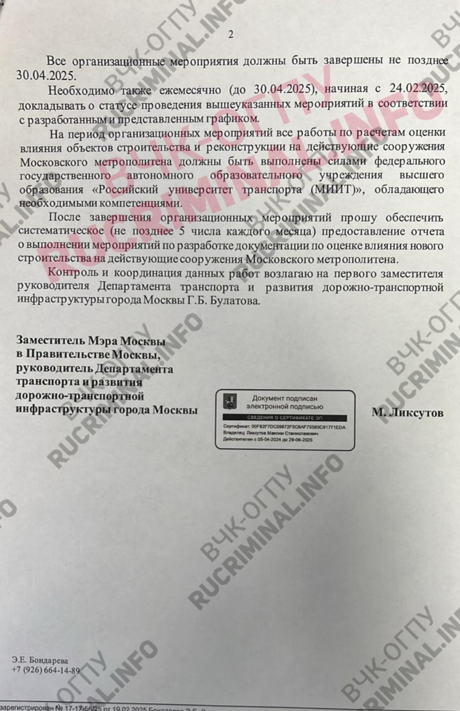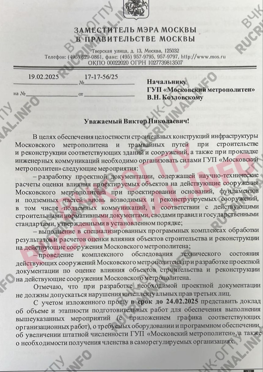 Effective February 19, 2025, Deputy Mayor of Moscow Maxim Liksutov signed a decree addressed to the State Unitary Enterprise "Moscow Metropolitan," requiring every developer within the metro's security zone, which covers approximately half of Moscow's entire city, to commission work from RUT MIIT (see document). Also known as the Russian University of Transport.
