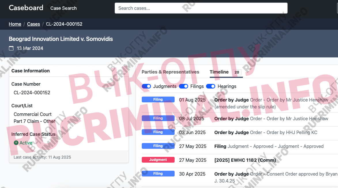 Realizing that an old loan could be recovered from him in a British court, Somovidis rushed to a Russian court to prohibit BEOGRAD from pursuing the case against him abroad in order to complete the bankruptcy process. Even the criminal case opened under Part 4 of Article 159 (fraud on an especially large scale) and Subsection "b" of Part 4 of Article 174.1 (money laundering) didn't stop him. However, the Russian arbitration court showed striking unanimity with the British court and rejected Somovidis's case.