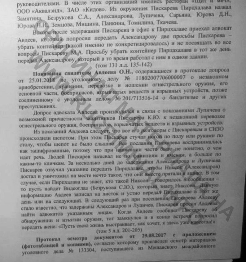 «Показания свидетеля Авдеева О.Н…. Допрос адвоката Авдеева производился в связи с показаниями Лупичева о возможной причастности заащитников Пискарева К.Ю. к незаконной перевозке огнестрельного оружия, боеприпасов, взрывчатых веществ и взрывных устройств. Из показаний Авдеева следует, что все его разговоры с Пискаревым СИЗО происходили шепотом. При этом Пискарев стучал ногой по полу или руками по столу, чтобы шепот не было слышно. Все послания Пискарева воспринимались как зашифрованные, потому что при написании часто было не понятно, о чем идет речь. Людей Пискарев называл не по фамилиям и именам, а больше по каким-то кличкам. За несколько дней до задержания Александрова и Лупичева Пискарев озвучил указание передать Пирцхалаве, чтобы Никсон (Александров) достал и уничтожил на месте нечто такое, что они вместе прятали в ящике. В том случае, если Пирцхалава не знает, кто такой Никсон говорилось в сообщении, то пусть найдет Видеоглаз (Безрукова С.Ю.), который знает Никсона. Данную информацию Авдеев записал на листок и устно передал Пирцхалаве в этот же день или на следующий. В следующий раз при посещении Пискарева Авдееву стало известно, что задержаны Александров и Лупичев. Пискарев просил Авдеева найти адвокатов указанным лицам. Когда Авдеев сообщил Пискареву об обнаружении и изьятии оружия, тот замкнулся, в конце встречи попросил передать жене: «Пусть свою жизнь выстраивает, как хочет, я здесь уже навсегда ».