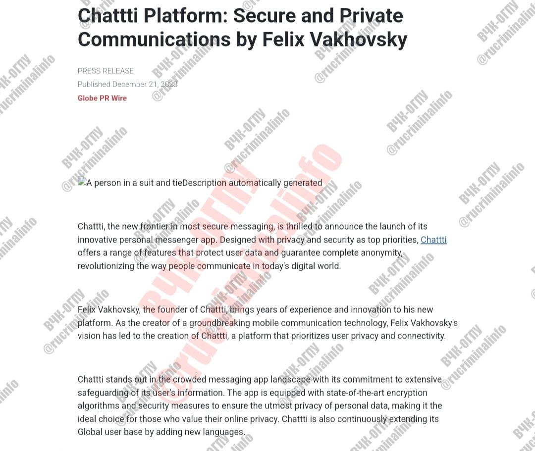 На фоне блокировок голосовых вызовов у WhatsApp и Telegram (Signal был заблокирован раньше) и недоверия к госMAX, у россиян стремительно набирает популярность мессенджер Chattti. Информация о нем передается от знакомых к знакомым и позиционируется он, как «полностью безопасный», содержимое которого недоступно для российских властей и спецслужб. Мол, Chattti разработан специалистами в ОАЭ, полностью анонимный, «не собирает ваши личные данные и хранит историю переписки только на вашем устройстве». Расследование ВЧК-ОГПУ показало, что в реальности Chattti это российский проект «Глобал Телеком», а стоит за ним решальщик Феликс Ваховски, который работает под кураторством советника президента РФ Антона Кобякова. Так, что Chattti это тоже кремлевский мессенджер и предназначен для тех, кто боится MAX.