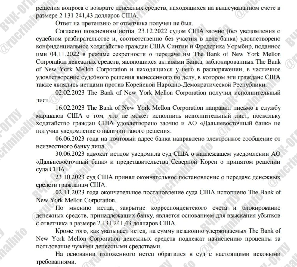 ВЧК-ОГПУ стало известно о совершенно потрясающей истории. Российский банк, обслуживавший правительство Северной Кореи, хранил миллионы долларов в США. Деньги были заблокированы и по решению американского суда переданы двум гражданам США, замученным до смерти в тюрьмах Северной Кореи. Теперь банк в российском суде взыскал эти средства с американского банка.