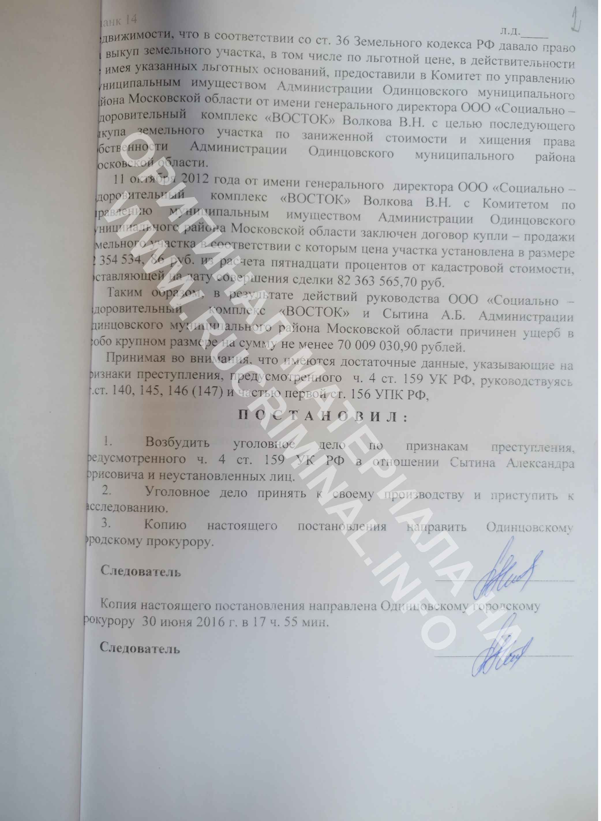 Около 10 лет назад Председатель Правления АО «Русстройбанк» Струков приобрел в собственность ООО «Социально - оздоровительный комплекс «ВОСТОК («СОК «ВОСТОК»), на балансе которого находилось имущество в Одинцовском районе Московской области: оздоровительный лагерь «Восток» в виде 32 объектов недвижимости и земельный участок площадью около 9 га. Имущество не подлежало приватизации согласно Приложению №1 к плану приватизации, утвержденного Председателем комиссии по приватизации при Москомимуществе от 20.03.1992г. Сытин, являясь другом семьи Струкова и его советником, предложил Струкову похитить имущество оздоровительного лагеря «Восток», а также права собственности Администрации Одинцовского муниципального района Московской области на земельный участок с кадастровым номером 50:20:0000000:1615, общей площадью около 9 га., для чего, с целью придания законности владения указанными объектами недвижимости, изготовил поддельный план приватизации от 20 марта 1992 г. Арендного предприятия «Московский экспериментальный центр парикмахерских услуг «Краса», в состав которого входил пионерский лагерь «Восток» фактически без права приватизации, скрыв наличие приложения № 1 к указанному плану, а также изменил первоначальное содержание плана приватизации, которые якобы свидетельствовали о правовых основаниях регистрации прав собственности ООО «СОК «ВОСТОК», в действительности таковыми не являющиеся. Сытин организовал предоставление указанных поддельных документов в Звенигородский отдел Управления Федеральной службы государственной регистрации, кадастра и картографии по Московской области. Введённые в заблуждение сотрудники Звенигородского отдела Управления Федеральной службы государственной регистрации, кадастра и картографии по Московской области на основании представленных подложных и недостоверных документов зарегистрировали право собственности ООО «СОК «ВОСТОК» на 32 объекта недвижимости общей кадастровой стоимостью 258 млн. 126 тыс. рублей.