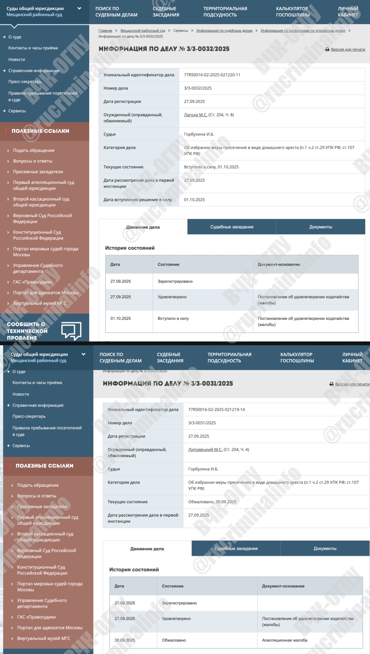 27 сентября 2025г, как видно из картотеки судов общей юрисдикции Лагоде М.С., (дело 3/3-0032/2025), Липовецкому М.С. (дело 3/3-0031/2025) Мещанским районным судом г. Москвы была избрана мера пресечения. Лагоде предъявлено обвинение по ч.8 ст.204 УК РФ, Липовецкому по ч.4 ст.204 УК РФ.