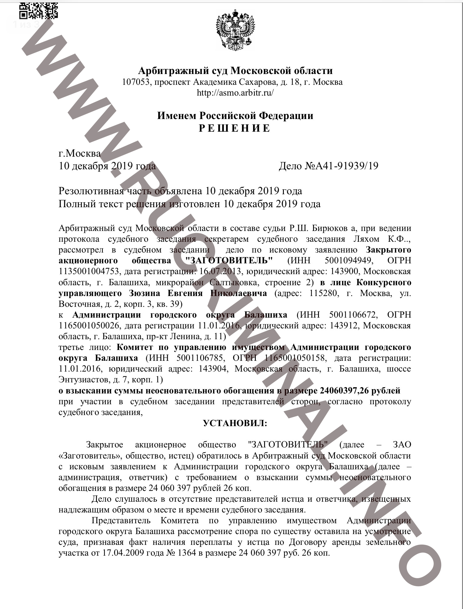 Для того что бы пустить пыль в глаза был подан в суд иск на компанию ЗАО «Заготовитель» на 6,2 миллиарда рублей. Администрация городского округа Балашиха этот суд выиграла, но денег никто не увидел. Сначала Арбитражный суд Московской области приостановил этот иск , а потом и вообще вся эта ситуация забылась . Но буквально недавно десятый Арбитражный апелляционный суд поставил точку в одном очень интересном решении , а именно выплатить более 24 миллионов рублей ЗАО "Заготовитель " за переплату арендой платы за землю . Дальше мы заходим на сайт ФССП РФ и смотрим ЗАО «Заготовитель» и видим, что никакого исполнительного производства на 6.2 миллиарда в отношении ЗАО «Заготовитель» нет . Что мы имеем в итоге ? Вся эта шумиха с поручением Президента РФ превратилась в пшик. Никто не понёс наказания. Были вложены огромные бюджетные средства на рекультивацию, но свалка продолжает мешать жителям вонью. Более того, владельцам свалки из бюджета выплатили более 24 миллионов рублей при том, что экологический ущерб был оценен в сумму 6,2 миллиарда. Просто браво Андрей Юрьевич Воробьев.