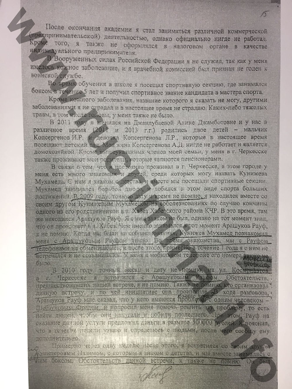 Следственный комитет России сформировала следственно-оперативную группу, которая будет расследовать дела об убийствах в 2010 году в КЧР двух общественных деятелей - Фраля Шебзухова и Аслана Жукова. Главным фигурантом этих расследований является сенатор Рауф Арашуков. На него, как организатора нападений, дают показания исполнители и посредники при передаче «заказа». В прошлой статье rucriminal.info привел показания Расула Аджиева, который застрелил Жукова. В них он признается, что преступление оплатил зять Арашукова Руслан Агоев (прячется сейчас в ОАЭ), который действовал в интересах сенатора. В новой публикации мы приводим показания Рустама Копсергенова, который подбирал киллеров для устранения Шебзухова. Он подробно описал следователям, где и когда встречался с Арашуковым, как тот передавал ему «заказ» и выплачивал гонорар.