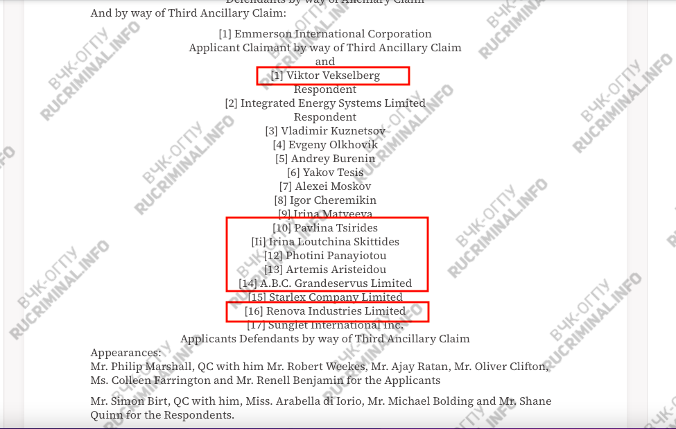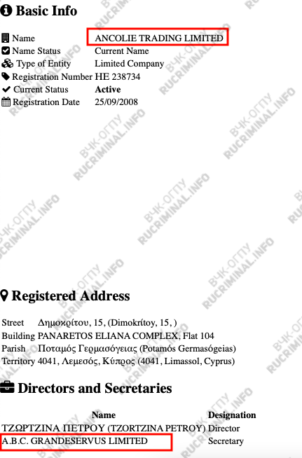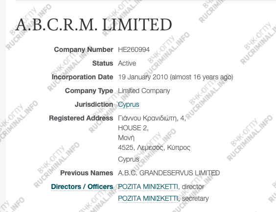 При этом представители A.B.C. GRANDESERVUS входили в число аффилированных лиц российских и украинских компаний, а не «просто администрировали» кипрские фирмы. Так, в годовом отчете ОАО «Химпром» (входит в «Ренова») упоминается Irina Kleanthous как физлицо, которое вместе с «Химпромом» контролируется одним и тем же лицом. То есть конечным бенефициаром «Реновы» — Вексельбергом. Irina Kleanthous - сотрудница A.B.C.