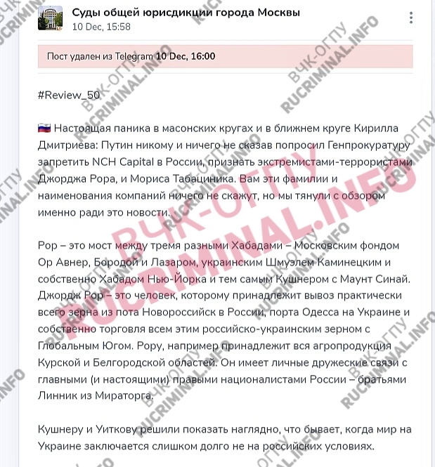 Источники ВЧК-ОГПУ и Rucriminal.info подсказывают, что скандальный пост в телеграм-канале Мосгорсуда по ошибке выставила не пресс-секретарь Елена Фомина, а ее заместитель Вадим Полежаев, который ведет еще канал АНП. Действительно в этом канале публикуются подобные Review с нумерацией. Пост предназначался для канала, но Полежаев отправил его в официальный «рупор» Мосгорсуда. Пост состоит из теорий заговоров, рассказывает о панике Кирилла Дмитриева, происках масонов, «любимом коррупционере Путина» из Евросоюза и т.д. и т.п.