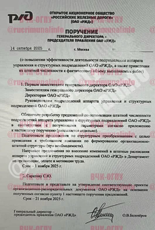 В распоряжение ВЧК-ОГПУ оказались документы о том, как Российские железные будут реализовывать план по сокращению («оптимизации») штатов. Минимальная планка по сокращению поставлена — это 6%. Если удастся больше, то руководство РЖД это только приветствует.