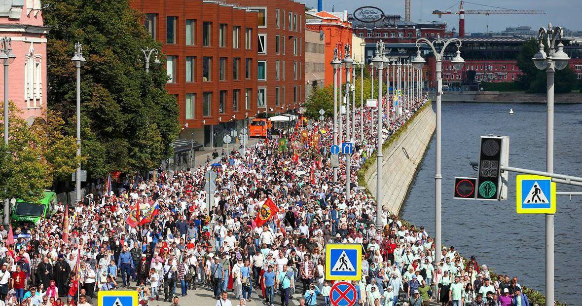 Воскресное шествие - крестный ход, который от Храма Христа спасителя до Новодевичьего монастыря, прошел 7 сентября в Москве, вызвал серьезную панику во властных этажах. Казалось совершенно нейтральное и аполитичное мероприятие, проводимое самим Патриархом Кириллом (Гундяев) не должно было стать раздражителем действующему режиму, а напротив показать единение верующих, представителей РПЦ с действующей властью. Было заявлено не более 20 тысяч участников шествия с церковными лозунгами и демонстрацией икон. Были аккредитованы представители всех пропагандистских СМИ, для патриотичных репортажей. На деле все вышло несколько иначе, крестных ход собрал под своими знаменами по официальным данным 40 тысяч (точно можно сказать, что эта цифра была занижена) , а по неофициальным до 120 тысяч участников. Значительная часть которых были хорошо организованные молодые люди из числа футбольных фанатов, ветеранов, представителей "Русской общины" и других националистических группировок. И пришли они показать себя, как серьезную силу. Тем самым очень напугав московские и федеральные власти, полицию и ФСБ. По сути в Москве прошел «Русский марш», длиною от ХСП до Новодевичьего монастыря.