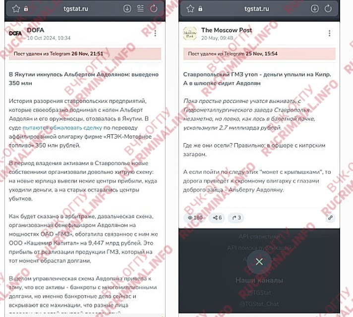 Десятки негативных статей об Авдоляне исчезли со следующих ресурсов: DOFA, Moscow Post, Utro News, Небоход Медиа и т.д. Всего из Интернета и Телеграм исчезли сотни статей и постов об этом олигархе- «чисткой» он занимается с ноября. Найти некоторые посты можно только в репостах у других каналов, куда еще не добрался Авдолян.