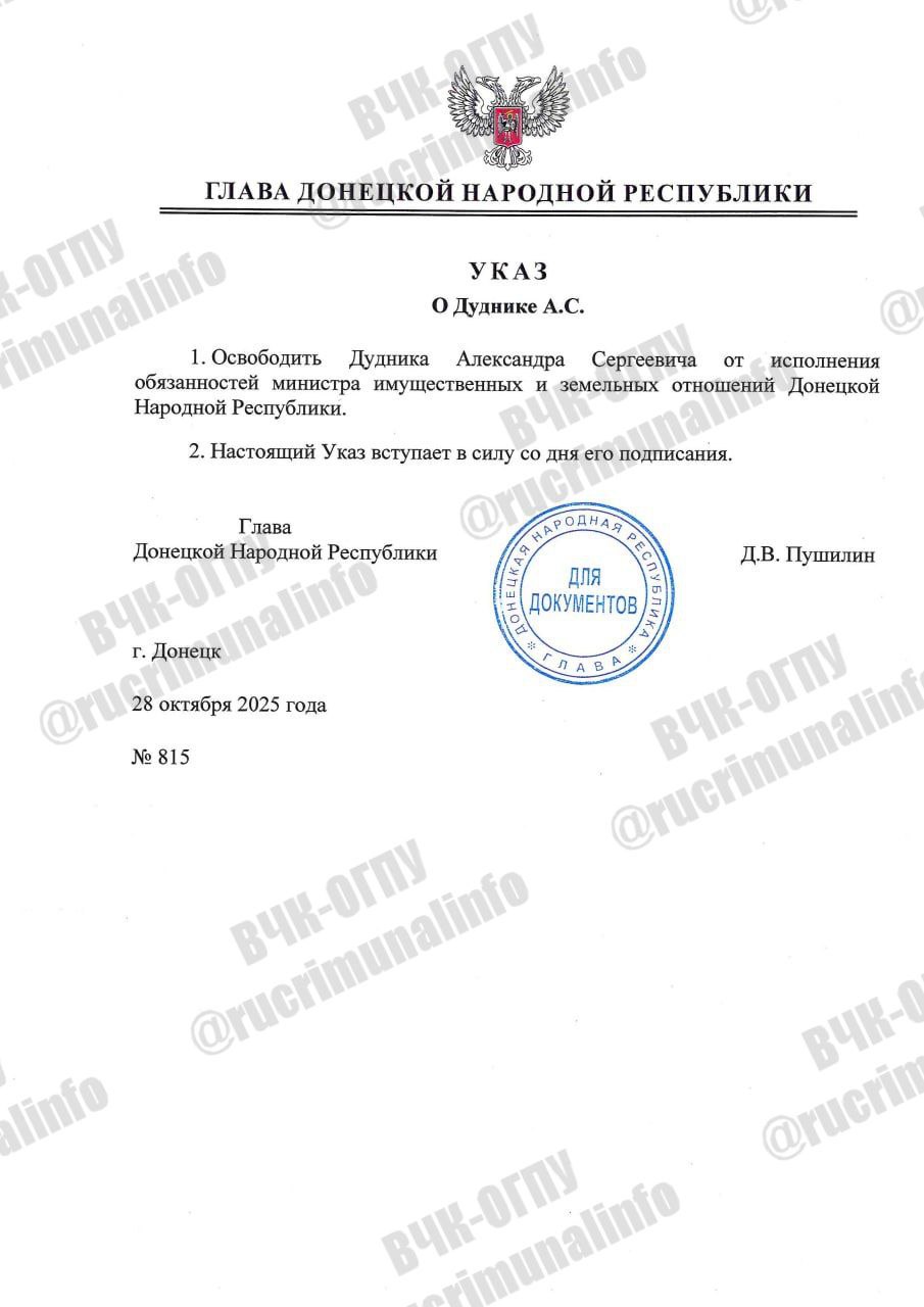 Вчера после публикации ВЧК-ОГПУ в администрации ДНР начались разборки на тему: «это позор на всю страну». Однако вместо того, что вернуть проект сноса Азовстали в нормальное русло, Пушилин в 21:17 своим указом сносит озвучивавшего сомнения министра имущественных и земельных отношений Дудника А.С. Вместо него назначают Ходоса Якова Валерьевича. Коллеги по принятию решению о «распиле» завода будет на днях и новый министр явно не успеет войти в курс дела. Но и остановить процесс тоже не сможет. В Москве Волошин и Хачанян сегодня планируют развести по нужным людям деньги, только чтобы никто не остановил проведение коллегии.