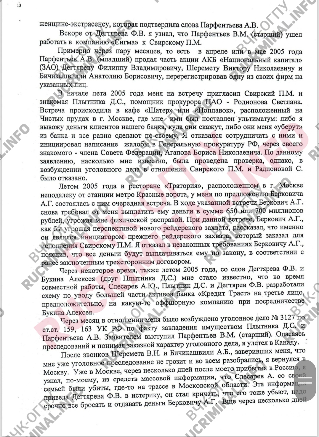 « В начале лета 2005 года меня на встречу пригласил Свирский П.М. и знакомая Плытника Д.С., помощник прокурора ЦАО Радионова Светлана. Встреча происходила в кафе «Шатер» или «Поплавок», расположенный на Чистых прудах в г. Москве, где мне ими был поставлен ультиматум: либо я вывожу деньги клиентов нашего банка, куда они скажут, либо они меня «уберут» из банка и все равно сделают по-своему. Я отказался сотрудничать с ними и инициировал написание жалобы в Генеральную прокуратуру РФ, через своего знакомого члена Совета Федерации, Агапова Бориса Николаевича. По данному заявлению, насколько мне известно, была проведена проверка, однако, в возбуждении уголовного дела в отношении Свирского П.М. и Радионовой С. было отказано.