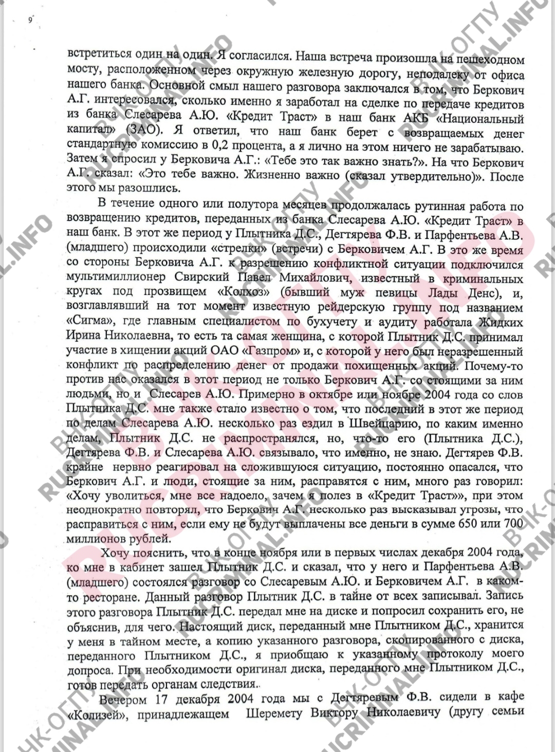 Через некоторое время, также летом 2005 года, со слов Дегтярева Ф.В. и Букина Алексея (друг Плытника Д.С.) мне стало известно, что во время совместной работы, Слесарев А.Ю., Плытник Д.С. и Дегтярев Ф.В. разработали схему по уводу большей части активов банка «Кредит Траст» на третье лицо, предположительно, на какую-то оффшорную компанию при посредничестве Букина Алексея.